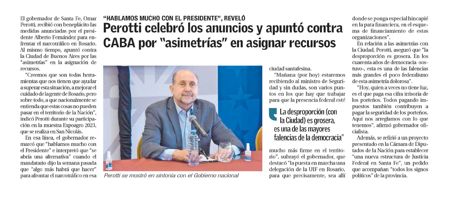 El gobernador de Santa Fe, Omar Perotti, recibió con beneplácito las medidas anunciadas por el presidente Alberto Fernández para enfrentar el narcotráfico en Rosario. Al mismo tiempo, apuntó contra la Ciudad de Buenos Aires por las «asimetrías» en la asignación de recursos. «Creemos que son todas herramientas que nos tienen que ayudar a superar esta situación, a mejorar el cuidado de la gente de Rosario, pero sobre todo, a que nacionalmente se entienda que estas cosas no pueden pasar en el territorio de la Nación», indicó Perotti durante su participación en la muestra Expoagro 2023, que se realiza en San Nicolás. En esa línea, el gobernador remarcó que «hablamos mucho con el Presidente» e interpretó que «se abría una alternativa» cuando el mandatario dijo la semana pasada que «algo más habrá que hacer» para afrontar el narcotráfico en esa ciudad santafesina. «Mañana (por hoy) estaremos recibiendo al ministro de Seguridad y sin dudas, son varios puntos en los que hay que trabajar para que la presencia federal esté mucho más firme en el territorio», subrayó el gobernador, que destacó «la puesta en marcha una delegación de la UIF en Rosario, para que precisamente, sea allí donde se ponga especial hincapié en la pata financiera, en el esquema de financiamiento de estas organizaciones». En relación a las asimetrías con la Ciudad, Perotti, aseguró que «la desproporción es grosera. En los cuarenta años de democracia -sostuvo-, esta es una de las falencias más grandes el poco federalismo de esta asimetría dolorosa». «Hoy, quien a veces no tiene luz, es el que paga esa cifra irrisoria de los porteños. Todos pagando impuestos también contribuyen a pagar la seguridad de los porteños. Aquí nos arreglamos con lo que tenemos», afirmó gobernador oficialista. Además, se refirió a un proyecto presentado en la Cámara de Diputados de la Nación para establecer «una nueva estructura de Justicia Federal en Santa Fe», un pedido que acompañan «todos los signos políticos» de la provincia.