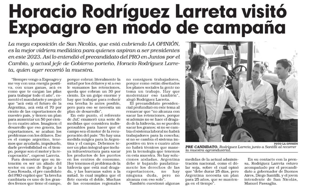 La mega exposición de San Nicolás, que está cubriendo LA OPINIÓN, es la mejor vidriera mediática para quienes aspiran a ser presidentes en este 2023. Así lo entendió el precandidato del PRO en Juntos por el Cambio, y aclual jefe de Gobierno porteño, Horacio Rodríguez Larreta, quien ayer recorrió la muestra.
