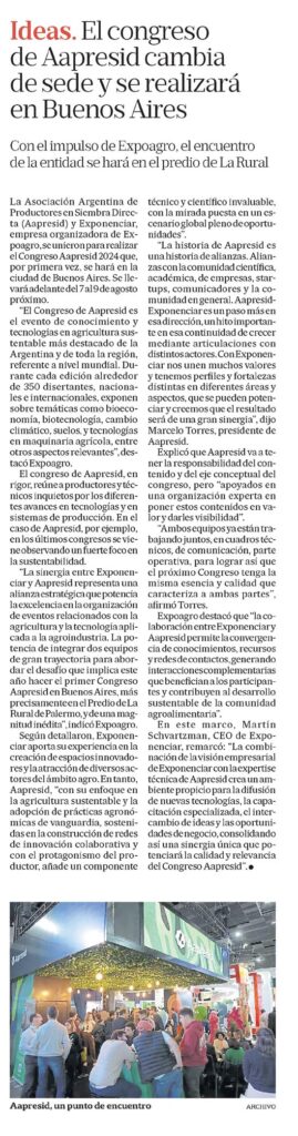 Con el impulso de Expoagro, el encuentro de la entidad se hará en el predio de La Ruralla asociación argentina de productores en Siembra Directa (aapresid) y Exponenciar, empresa organizadora de Expoagro, se unieron para realizar el congreso aapresid 2024 que, por primera vez, se hará en la ciudad de Buenos aires. Se llevará adelante del 7 al 9 de agosto próximo.»El congreso de aapresid es el evento de conocimiento y tecnologías en agricultura sustentable más destacado de la argentina y de toda la región, referente a nivel mundial. Durante cada edición alrededor de 350 disertantes, nacionales e internacionales, exponen sobre temáticas como bioeconomía, biotecnología, cambio climático, suelos, y tecnologías en maquinaria agrícola, entre otros aspectos relevantes», destacó Expoagro.El congreso de aapresid, en rigor, reúne a productores y técnicos inquietos por los diferentes avances en tecnologías y en sistemas de producción. En el caso de aapresid, por ejemplo, en los últimos congresos se viene observando un fuerte foco en la sustentabilidad.»la sinergia entre Exponenciar y aapresid representa una alianza estratégica que potencia la excelencia en la organización de eventos relacionados con la agricultura y la tecnología aplicada a la agroindustria. la potencia de integrar dos equipos de gran trayectoria para abordar el desafío que implica este año hacer el primer congreso aapresid en Buenos aires, más precisamente en el predio de la rural de palermo, y de una magnitud inédita», indicó Expoagro.Según detallaron, Exponenciar aporta su experiencia en la creación de espacios innovadores y la atracción de diversos actores del ámbito agro. En tanto, aapresid, «con su enfoque en la agricultura sustentable y la adopción de prácticas agronómicas de vanguardia, sostenidas en la construcción de redes de innovación colaborativa y con el protagonismo del productor, añade un componente técnico y científico invaluable, con la mirada puesta en un escenario global pleno de oportunidades».»la historia de aapresid es una historia de alianzas. alianzas con la comunidad científica, académica, de empresas, startups, comunicadores y la comunidad en general. aapresid- Exponenciar es un paso más en esa dirección, un hito importante en esa continuidad de crecer mediante articulaciones con distintos actores. con Exponenciar nos unen muchos valores y tenemos perfiles y fortalezas distintas en diferentes áreas y aspectos, que se pueden potenciar y creemos que el resultado será de una gran sinergia», dijo Marcelo Torres, presidente de aapresid.Explicó que aapresid va a tener la responsabilidad del contenido y del eje conceptual del congreso, pero «apoyados en una organización experta en poner estos contenidos en valor y darles visibilidad».»ambos equipos ya están trabajando juntos, en cuadros técnicos, de comunicación, parte operativa, para lograr así que el próximo congreso tenga la misma esencia y calidad que caracteriza a ambas partes», afirmó Torres.Expoagro destacó que «la colaboración entre Exponenciar y aapresid permite la convergencia de conocimientos, recursos y redes de contactos, generando interacciones complementarias que benefician a los participantes y contribuyen al desarrollo sustentable de la comunidad agroalimentaria».En este marco, Martín Schvartzman, cEo de Exponenciar, remarcó: «la combinación de la visión empresarial de Exponenciar con la expertise técnica de aapresid crea un ambiente propicio para la difusión de nuevas tecnologías, la capacitación especializada, el intercambio de ideas y las oportunidades de negocio, consolidando así una sinergia única que potenciará la calidad y relevancia del congreso aapresid».