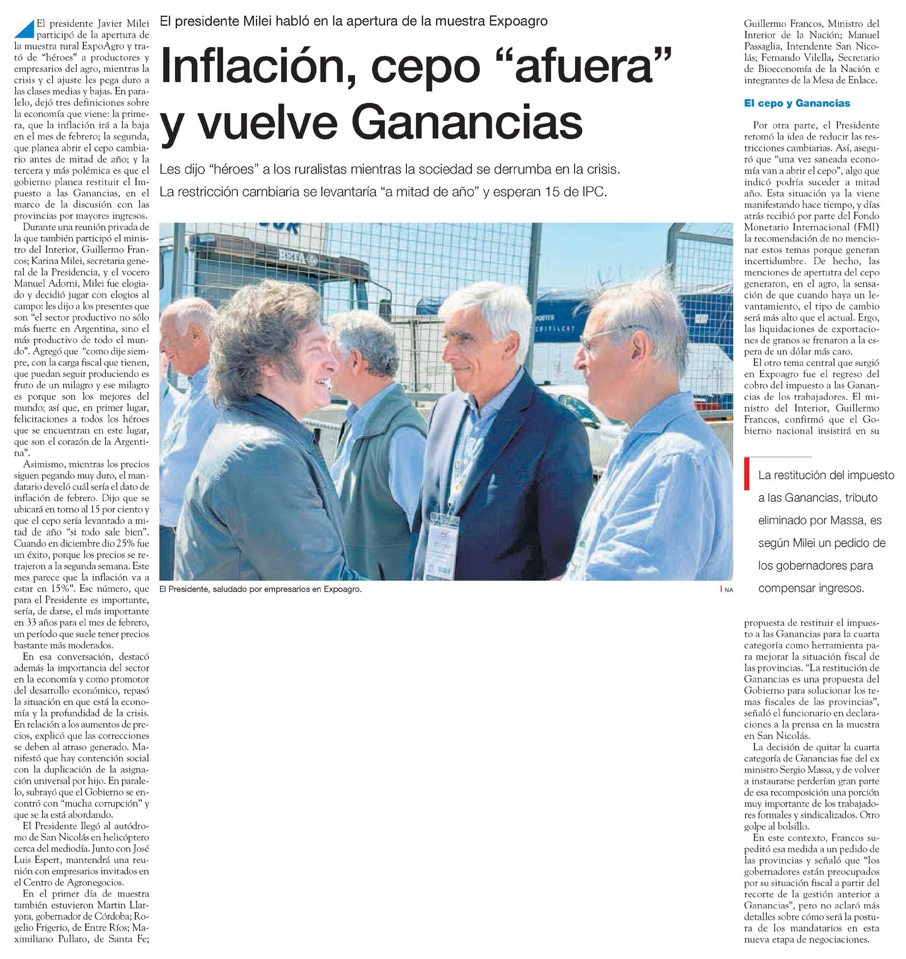 El presidente Javier Milei participó de la apertura de la muestra rural ExpoAgro y trató de «héroes» a productores y empresarios del agro, mientras la crisis y el ajuste les pega duro a las clases medias y bajas. En paralelo, dejó tres definiciones sobre la economía que viene: la primera, que la inflación irá a la baja en el mes de febrero; la segunda, que planea abrir el cepo cambiario antes de mitad de año; y la tercera y más polémica es que el gobierno planea restituir el Impuesto a las Ganancias, en el marco de la discusión con las provincias por mayores ingresos.