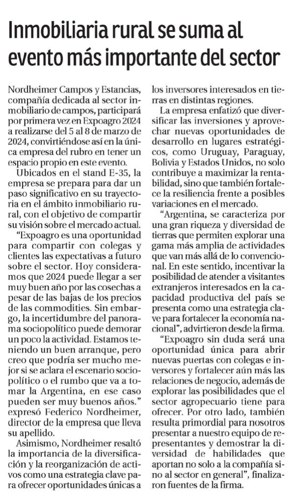 Nordheimer Campos y Estancias, compañía dedicada al sector inmobiliario de campos, participará por primera vez en Expoagro 2024 a realizarse del 5 al 8 de marzo de 2024, convirtiéndose así en la única empresa del rubro en tener un espacio propio en este evento.
