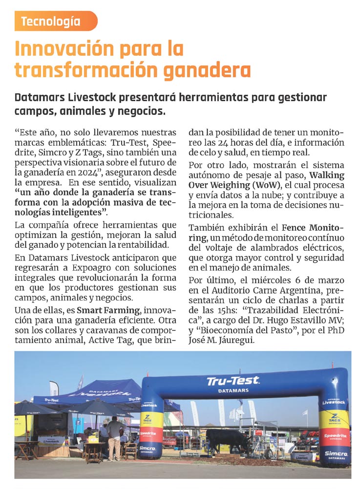 Datamars Livestock presentará herramientas para gestionar campos, animales y negocios.«Este año, no solo llevaremos nuestras marcas emblemáticas: Tru-Test, Spee- drite, Simcro y Z Tags, sino también una perspectiva visionaria sobre el futuro de la ganadería en 2024», aseguraron desde la empresa. En ese sentido, visualizan «un año donde la ganadería se transforma con la adopción masiva de tecnologías inteligentes».La compañía ofrece herramientas que optimizan la gestión, mejoran la salud del ganado y potencian la rentabilidad. En Datamars Livestock anticiparon que regresarán a Expoagro con soluciones integrales que revolucionarán la forma en que los productores gestionan sus campos, animales y negocios.Una de ellas, es Smart Farming, innovación para una ganadería eficiente. Otra son los collares y caravanas de comportamiento animal, Active Tag, que brindan la posibilidad de tener un monito- reo las 24 horas del día, e información de celo y salud, en tiempo real.Por otro lado, mostrarán el sistema autónomo de pesaje al paso, Walking Over Weighing (WoW), el cual procesa y envía datos a la nube; y contribuye a la mejora en la toma de decisiones nu- tricionales.También exhibirán el Fence Monito- ring,unmétododemonitoreo continuo del voltaje de alambrados eléctricos, que otorga mayor control y seguridad en el manejo de animales.Por último, el miércoles 6 de marzo en el Auditorio Carne Argentina, presentarán un ciclo de charlas a partir de las I5hs: «Trazabilidad Electrónica», a cargo del Dr. Hugo Estavillo MV; y «Bioeconomía del Pasto», por el PhD JoséM. Jáuregui.