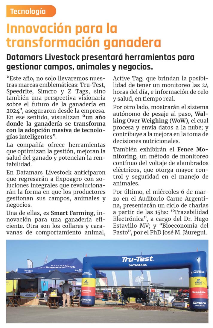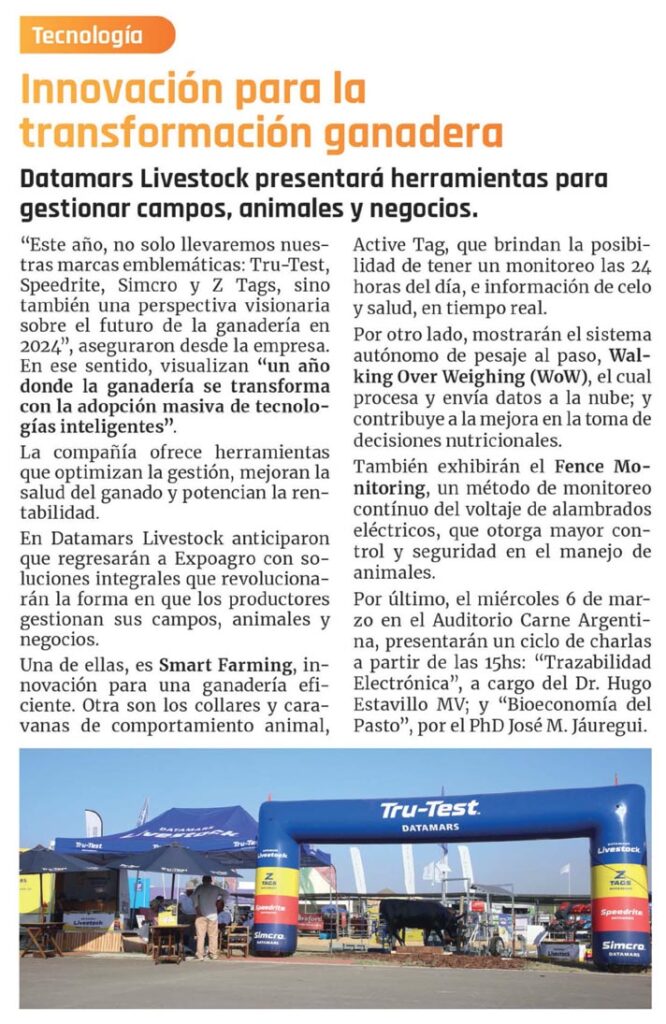 Datamars Livestock presentará herramientas para gestionar campos, animales y negocios.«Este año, no solo llevaremos nuestras marcas emblemáticas: Tru-Test, Speedrite, Simcro y Z Tags, sino también una perspectiva visionaria sobre el futuro de la ganadería en 2024», aseguraron desde la empresa. En ese sentido, visualizan «un año donde la ganadería se transforma con la adopción masiva de tecnologías inteligentes».La compañía ofrece herramientas que optimizan la gestión, mejoran la salud del ganado y potencian la rentabilidad.En Datamars Livestock anticiparon que regresarán a Expoagro con soluciones integrales que revolucionarán la forma en que los productores gestionan sus campos, animales y negocios.Una de ellas, es Smart Farming, innovación para una ganadería eficiente. Otra son los collares y caravanas de comportamiento animal, Active Tag, que brindan la posibilidad de tener un monitoreo las 24 horas del día, e información de celo y salud, en tiempo real.Por otro lado, mostrarán el sistema autónomo de pesaje al paso, Wal- king Over Weighing (WoW), el cual procesa y envía datos a la nube; y contribuye a la mejora en la toma de decisiones nutricionales.También exhibirán el Fence Mo- nitoring, un método de monitoreo continuo del voltaje de alambrados eléctricos, que otorga mayor control y seguridad en el manejo de animales.Por último, el miércoles 6 de marzo en el Auditorio Carne Argentina, presentarán un ciclo de charlas a partir de las I5hs: «Trazabilidad Electrónica», a cargo del Dr. Hugo Estavillo MV; y «Bioeconomía del Pasto», por el PhD José M. Jáuregui.