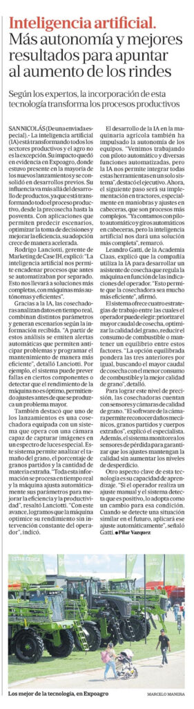 … especial).- La inteligencia artificial (IA) está transformando todos los sectores productivos y el agro no es la excepción. Su impacto quedó en evidencia en Expoagro, donde estuvo prese nte en la mayoría de los nuevos lanzamientos y se consolidó en desarrollos previos. Su influencia va más allá del desarrollo de productos,…