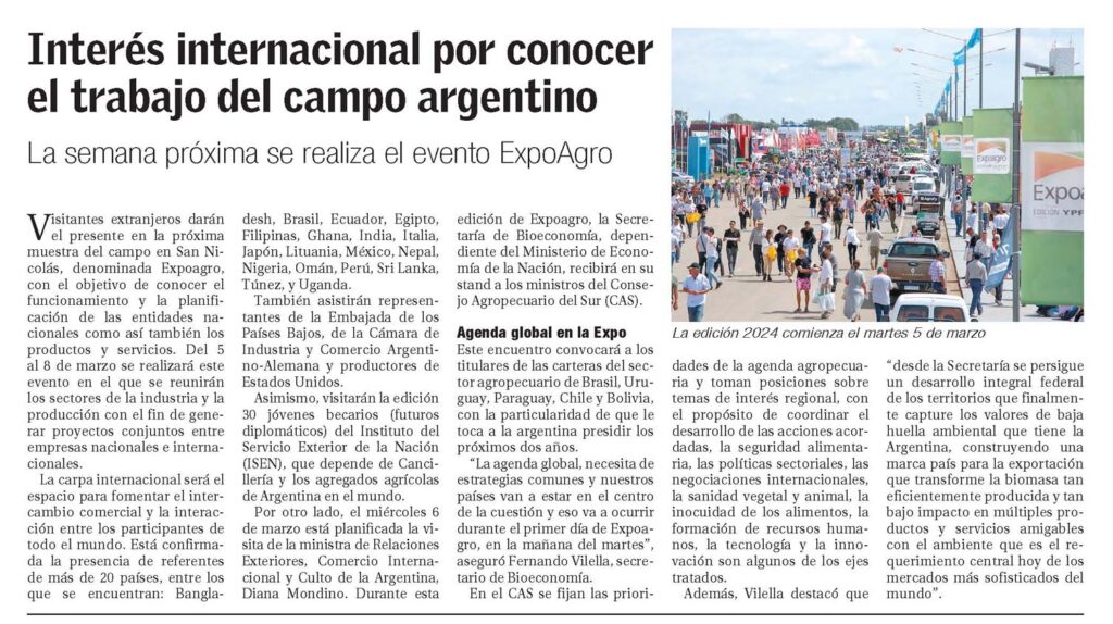La semana próxima se realiza el evento ExpoAgroVisitantes extranjeros darán el presente en la próxima muestra del campo en San Nicolás, denominada Expoagro, con el objetivo de conocer el funcionamiento y la planificación de las entidades nacionales como así también los productos y servicios. Del 5 al 8 de marzo se realizará este evento en el que se reunirán los sectores de la industria y la producción con el fin de generar proyectos conjuntos entre empresas nacionales e internacionales.La carpa internacional será el espacio para fomentar el intercambio comercial y la interacción entre los participantes de todo el mundo. Está confirmada la presencia de referentes de más de 20 países, entre los que se encuentran: Bangladesh, Brasil, Ecuador, Egipto, Filipinas, Ghana, India, Italia, Japón, Lituania, México, Nepal, Nigeria, Omán, Perú, Sri Lanka, Túnez, y Uganda.También asistirán representantes de la Embajada de los Países Bajos, de la Cámara de Industria y Comercio Argentino- Alemana y productores de Estados Unidos.Asimismo, visitarán la edición 30 jóvenes becarios (futuros diplomáticos) del Instituto del Servicio Exterior de la Nación (ISEN), que depende de Cancillería y los agregados agrícolas de Argentina en el mundo.Por otro lado, el miércoles 6 de marzo está planificada la visita de la ministra de Relaciones Exteriores, Comercio Internacional y Culto de la Argentina, Diana Mondino. Durante esta edición de Expoagro, la Secretaría de Bioeconomía, dependiente del Ministerio de Economía de la Nación, recibirá en su stand a los ministros del Consejo Agropecuario del Sur (CAS).Agenda global en la Expo Este encuentro convocará a los titulares de las carteras del sector agropecuario de Brasil, Uruguay, Paraguay, Chile y Bolivia, con la particularidad de que le toca a la argentina presidir los próximos dos años.»La agenda global, necesita de estrategias comunes y nuestros países van a estar en el centro de la cuestión y eso va a ocurrir durante el primer día de Expoagro, en la mañana del martes», aseguró Fernando Vilella, secretario de Bioeconomía.En el CAS se fijan las prioridades de la agenda agropecuaria y toman posiciones sobre temas de interés regional, con el propósito de coordinar el desarrollo de las acciones acordadas, la seguridad alimentaria, las políticas sectoriales, las negociaciones internacionales, la sanidad vegetal y animal, la inocuidad de los alimentos, la formación de recursos humanos, la tecnología y la innovación son algunos de los ejes tratados.Además, Vilella destacó que «desde la Secretaría se persigue un desarrollo integral federal de los territorios que finalmente capture los valores de baja huella ambiental que tiene la Argentina, construyendo una marca país para la exportación que transforme la biomasa tan eficientemente producida y tan bajo impacto en múltiples productos y servicios amigables con el ambiente que es el requerimiento central hoy de los mercados más sofisticados del mundo».La edición 2024 comienza el martes 5 de marzo