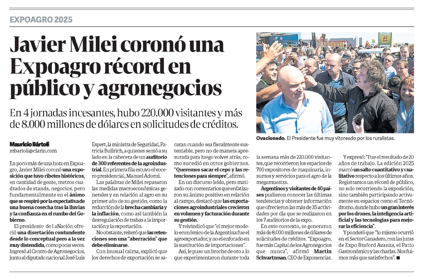 …En poco más de una hora en Ex poagro, Javier Milei coronó una exposición que tuvo ribetes históricos, en cantidad de gente, metros cuadrados de stands, negocios, pero fundamentalmente en…