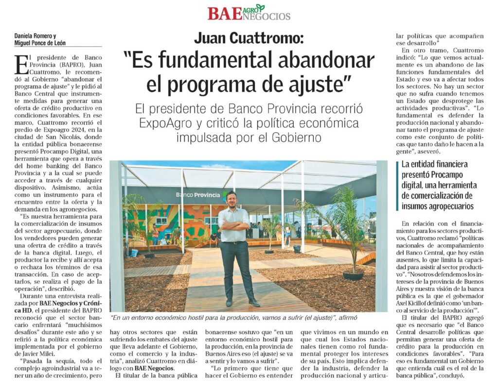 El presidente de Banco Provincia recorrió ExpoAgro y criticó la política económica impulsada por el GobiernoEl presidente de Banco Provincia (BAPRO), Juan Cuattromo, le recomendó al Gobierno «abandonar el programa de ajuste» y le pidió al Banco Central que instrumente medidas para generar una oferta de crédito productivo en condiciones favorables. En ese marco, Cuattromo recorrió el predio de Expoagro 2024, en la ciudad de San Nicolás, donde la entidad pública bonaerense presentó Procampo Digital, una herramienta que opera a través del home banking del Banco Provincia y a la cual se puede acceder a través de cualquier dispositivo. Asimismo, actúa como un instrumento para el encuentro entre la oferta y la demanda en los agronegocios.»Es nuestra herramienta para la comercialización de insumos del sector agropecuario, donde los vendedores pueden generar una ofertra de crédito a través de la banca digital. Luego, el productor la recibe y allí acepta o rechaza los términos de esa transacción. En caso de aceptarlos, se realiza el pago de la operación», describió.Durante una entrevista realizada por BAE Negocios y Crónica HD, el presidente del BAPRO reconoció que el sector bancario enfrentará «muchísimos desafíos» durante este año y se refirió a la política económica implementada por el gobierno de Javier Milei.»Pasada la sequía, todo el complejo agroindustrial va a tener un año de crecimiento, pero hay otros sectores que están sufriendo los embates del ajuste que lleva adelante el Gobierno, como el comercio y la industria», analizó Cuattromo en diálogo con BAE Negocios.El titular de la banca pública bonaerense sostuvo que «en un entorno económico hostil para la producción, en la provincia de Buenos Aires eso (el ajuste) se va a sentir y lo vamos a sufrir».»Lo primero que tiene que hacer el Gobierno es entender que vivimos en un mundo en que cual los Estados nacionales tienen como rol fundamental proteger los intereses de su país. Esto implica defender la industria, defender la producción nacional y articular políticas que acompañen ese desarrollo» En otro tramo, Cuattromo indicó: «Lo que vemos actualmente es un abandono de las funciones fundamentales del Estado y eso va a afectar todos los sectores. No hay un sector que no sufra cuando tenemos un Estado que desprotege las actividades productivas». «Lo fundamental es defender la producción nacional y abandonar tanto el programa de ajuste como este conjunto de políticas que tanto daño le hacen a la gente», aseveró.En relación con el financiamiento para los sectores productivos, Cuattromo reclamó «políticas nacionales de acompañamiento del Banco Central, que hoy están ausentes, lo que limita la capacidad para asistir al sector productivo».»Nosotros defendemos los intereses de la provincia de Buenos Aires y nuestra visión de la banca pública es la que el gobernador Axel Kicillof definió como ?un banco al servicio de la producción?».El titular del BAPRO agregó que es necesario que «el Banco Central desarrolle políticas que permitan generar una oferta de crédito para la producción en condiciones favorables». «Para eso es fundamental un Gobierno que entienda cuál es el rol de la banca pública», concluyó.