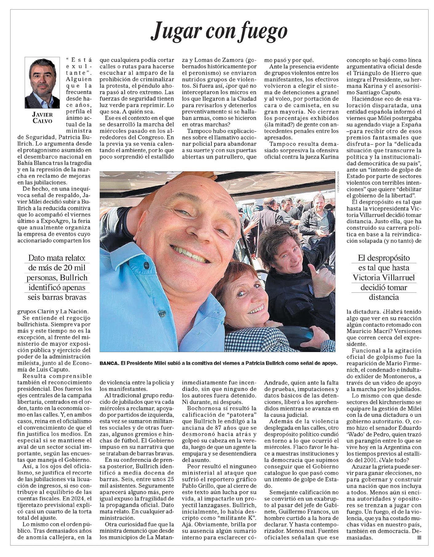 … jubilaciones. De hecho, en una inequívoca señal de respaldo, Javier Milei decidió subir a Bullrich a la reducida comitiva que lo acompañó el viernes último a ExpoAgro, la feria que anualmente organiza la empresa de eventos cuyo accionariado comparten los grupos Clarín y La Nación. Se entiende el regocijo bullrichista….