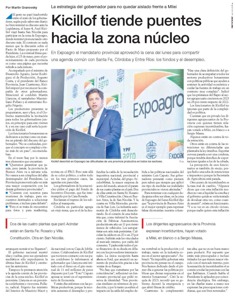 En Expoagro el mandatario provincial aprovechó la cena del lunes para compartir una agenda común con Santa Fe, Córdoba y Entre Ríos: los fondos y el desempleoEl gesto no pasó inadvertido entre el resto de los gobernadores, según pudo saber este diario: no bien terminó su discurso ante la Legislatura, el lunes 4, Axel Kicillof viajó hasta San Nicolás para participar en la cena de Expoagro, donde terminó pronunciando otro discurso más. El contexto es nada menos que la discusión sobre el Pacto de Mayo propuesto por el Presidente. La eventual firma queda lejos, el 25 de mayo, pero el posicionamiento de cada provincia es como una página que necesita refresh a cada minuto.Acompañado por el ministro de Desarrollo Agrario, Javier Rodríguez; el de Producción, Augusto Costa, y el presidente del Banco Provincia, Juan Cuattromo, Kicillof empezó por reconocer la compañía de otros gobernadores.Mencionó al cordobés Martín Llaryora, el santafesino Maximiliano Pullaro y al entrerriano Rogelio Frigerio.Los productores presentes se preguntaron, ayer y hoy, si el Gobierno mantendría la invitación para todos los gobernadores juntos, en principio para este viernes 8, y en ese caso cuál sería la posición de Kicillof.Los funcionarios bonaerenses se dedicaron a recitar como un mantra un párrafo del discurso del gobernador.»No se confundan, porque el concepto es complejo y tiene más de un paso», recomendaban.En el texto hay por lo menos tres elementos que encastran:»Queremos garantizar que jamás, pero jamás, la provincia de Buenos Aires va a salvarse sola.No vamos a ser cómplices del afán desintegrador del Presidente. La Provincia promoverá cada vez más una mayor cooperación con los demás gobiernos provinciales».»Cuenten con nosotros para reuniones de trabajo, para encuentros destinados a solucionar problemas, e incluso para debatir».»Pero si se trata de encuentros para fotos y para marketing, arranquen nomás si no llegamos».El gobierno nacional mostró idas y vueltas, pero sus operadores mediáticos sólo reprodujeron la última frase de Kicillof y omitieron las anteriores.Tampoco le prestaron atención a la agenda común de las provincias de la zona núcleo. Kicillof es peronista. Llaryora es un peronista cordobesista o viceversa. Pullaro, radical. Frigerio fue ministro del Interior de Mauricio Macri y revista en el PRO. Pero más allá de su color político, y sobre todo en los tres primeros casos, las agendas son parecidas.Los gobernadores de la zona núcleo piden el pago del Fondo de Incentivo Docente, que fue interrumpido por la Casa Rosada.Reclaman el regreso de los subsidios al transporte.Córdoba en particular agrega un viejo tema, que es el de la deuda nacional con su Caja de Jubilaciones.Colaboradores de Kicillof que tuvieron contacto con sus pares cordobeses le informaron al gobernador que Llaryora está irritado con el freno en el giro mensual de 11 mil millones de pesos dispuesto por Luis «Toto» Caputo apenas se sentó en el superministerio de Economía.Y están disconformes con las políticas productivas, porque la recesión aumenta el desempleo y profundiza la caída de la recaudación impositiva nacional, provincial y municipal. Acindar, del grupo ArcelorMittai, la mayor empresa de acero del mundo, anunció el parate de sus cuatro plantas en el país. Dos de ellas están en Santa Fe: Rosario y Villa Constitución. Otra en Buenos Aires, la de San Nicolás. Y la cuarta en Villa Mercedes, provincia de San Luis. La industria automotriz de Córdoba está desacelerando.Es el corazón de una industria que, como informó la Asociación de Fábricas Automotrices, producirá este año un 11 por ciento menos de vehículos. Los autopartistas son aún más pesimistas. Calculan la caída en un 20 o un 25 por ciento. Sufrirán más los vinculados al mercado interno, por caída del consumo. Y padecerán todos el peso financiero de su deuda en dólares con los proveedores internacionales.La única excepción hasta ahora es Ford, que anunció un aumento de producción gracias a las ventas de su Ranger.»No hay que extrañarse por las coincidencias», reflexionó un funcionario provincial que pidió reserva de identidad. «Son provincias similares en términos de producción, y por lo tanto ya sufren el impacto en la caída del empleo debida a las políticas nacionales del ministro Luis Caputo. Sus gobernadores pensarán como piensen pero saben que siempre que aplicó ese tipo de medidas sus realidades provinciales se vieron afectadas.» Para terminar con cualquier duda ajena sobre sus ideas, en la cena de Expoagro del lunes Kicillof dijo que «la provincia de Buenos Aires es el mejor ejemplo para repensar falsas dicotomías: nuestra columna vertebral es la producción y el trabajo, tanto en la industria como en el sector agropecuario». Subrayó: «Es imposible gobernar esta provincia sin pensar en el campo.Nos hemos dedicado desde el primer día a generar las políticas públicas que dieran respuestas en el interior bonaerense». Citó la sequía de 2023, recordó que su gobierno decretó la emergencia y que abrió líneas de crédito.Cuattromo lo complementó: «Hay una clara definición del gobernador de acompañar a todos los sectores productivos bonaerenses con políticas públicas que ayuden a sostener la actividad económica y cuidar las fuentes de trabajo en un contexto muy complejo». Indicó que los préstamos del Bapro al sector agropecuario crecieron en 2023 un 28 por ciento respecto de 2022.Los funcionarios de Kicillof no ignoran que parte de la complejidad es política.Cuentan que en privado los dirigentes agropecuarios de la Provincia con quienes tienen relación expresan incertidumbre, hayan votado a Milei, en blanco o a Sergio Massa.Algunos están en contra de toda retención.Otros están en contra de las retenciones no diferenciadas que planteaba la ley ómnibus. Exportar cerveza pasaría a ser una condena, porque tendría derechos de exportaciones 