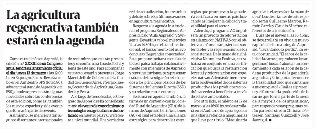 Se suma en agenda también, la firma de un convenio con la Sociedad Rural de Argentina (SRA) de la mano de Aapresid Certificaciones (AC), el cual establece una alianza estratégica para desarrollar estra tegias que promuevan la ganadería certificada en nuestro país, buscando así mejorar la calidad y trazabilidad para el sector.