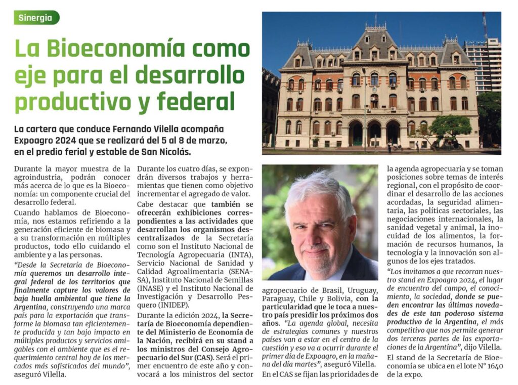 La cartera que conduce Fernando Vilella acompaña Expoagro 2024 que se realizara del 5 al 8 de marzo, en el predio ferial y estable de San Nicolás.Durante la mayor muestra de la agroindustria, podrán conocer más acerca de lo que es la Bioeconomía: un componente crucial del desarrollo federal.Cuando hablamos de Bioeconomía, nos estamos refiriendo a la generación eficiente de biomasa y a su transformación en múltiples productos, todo ello cuidando el ambiente y a las personas.»Desde la Secretaría de Bioeconomía queremos un desarrollo integral federal de los territorios que finalmente capture los valores de baja huella ambiental que tiene la Argentina, construyendo una marca país para la exportación que transforme la biomasa tan eficientemente producida y tan bajo impacto en múltiples productos y servicios amigables con el ambiente que es el requerimiento central hoy de los mercados más sofisticados del mundo», aseguróVilella.Durante los cuatro días, se expondrán diversos trabajos y herramientas que tienen como objetivo incrementar el agregado de valor. Cabe destacar que también se ofrecerán exhibiciones correspondientes a las actividades que desarrollan los organismos descentralizados de la Secretaría como son el Instituto Nacional de Tecnología Agropecuaria (INTA), Servicio Nacional de Sanidad y Calidad Agroalimentaria (SENASA), Instituto Nacional de Semillas (INASE) y el Instituto Nacional de Investigación y Desarrollo Pesquero (INI- DEP).Durante la edición 2024, la Secretaría de Bioeconomía dependiente del Ministerio de Economía de la Nación, recibirá en su stand a los ministros del Consejo Agropecuario del Sur (CAS). Será el primer encuentro de este año y convocará a los ministros del sector agropecuario de Brasil, Uruguay, Paraguay, Chile y Bolivia, con la particularidad que le toca a nuestro país presidir los próximos dos años. «La agenda global, necesita de estrategias comunes y nuestros países van a estar en el centro de la cuestión y eso va a ocurrir durante el primer día de Expoagro, en la mañana del día martes», aseguró Vilella.En el CAS se fijan las prioridades de la agenda agropecuaria y se toman posiciones sobre temas de interés regional, con el propósito de coordinar el desarrollo de las acciones acordadas, la seguridad alimentaria, las políticas sectoriales, las negociaciones internacionales, la sanidad vegetal y animal, la inocuidad de los alimentos, la formación de recursos humanos, la tecnología y la innovación son algunos de los ejes tratados.»Los invitamos a que recorran nuestro stand en Expoagro 2024, el lugar de encuentro del campo, el conocimiento, la sociedad, donde se pueden encontrar las últimas novedades de este tan poderoso sistema productivo de la Argentina, el más competitivo que nos permite generar dos terceras partes de las exportaciones de la Argentina», dijo Vilella.El stand de la Secretaría de Bioeconomía se ubica en el lote N° 1640 de la expo.