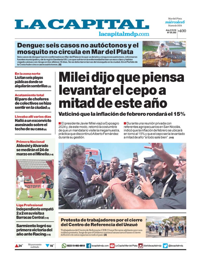 Milei dijo que piensa levantar el cepo a mitad de este añoVaticinó que la inflación de febrero rondará el 15%El presidente Javier Milei viajó a Expoagro 2024 y, de este modo, retomó la costumbre de que un mandatario visite la megamuestra, práctica que discontinuó Alberto Fernández durante su gestión.Durante una reunión privada con referentes agropecuarios en San Nicolás, indicó que la inflación de febrero se ubicará en torno al 15% y que el cepo sería levantado a mitad de año «si todo sale bien». (10)Protesta de trabajadores por el cierre del Centro de Referencia del UnzuéTrabajadores del Centro de Referencia (CDR) Unzué llevaron adelante ayer una ruidosa protesta, luego de que el Gobierno nacional anunciara el lunes el cierre definitivo de estos espacios en todo el país. (3)Dengue: seis casos no autóctonos y el mosquito no circula en Mar del PlataSeis casos de dengue fueron confirmados en Mar del Plata en lo que va del año y ninguno es autóctono, informaron fuentes municipales y de la región Sanitaria VIII. Los que sufrieron la enfermedad tenían un nexo claro y habían viajado a áreas con riesgo en los últimos 15 días. No se detectaron larvas del mosquito en la ciudad. En el Partido de la Costa hubo cinco casos autóctonos. (5)En la zona norteLicitan seis playas públicas donde se alquilarán sombrillas (2)Acatamiento totalEl paro de choferes de colectivos se hizo sentir en la ciudad (4)Llevaba allí varios díasHalló a un exconvicto asesinado sobre el techo de su casa (6)Primera NacionalAldosivi y Alvarado se medirán el 24 de marzo en el Minella (14)Liga ProfesionalIndependiente empató 2 a 2 en su visita a Barracas Central (15)Sarmiento logró su primera victoria del año ante Racing (15)