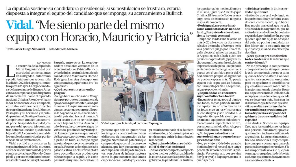 Vidal recibió a la nacion en la carpa institucional de la muestra, antes de iniciar su recorrida por los stands escoltada por Ritondo, Campbell, y por sus exministros bonaerenses Hernán Lacunza y Leonardo Sarquís, entre otros. La exgobernadora desalienta versiones de un acercamiento con Patricia Bullrich, evita definir si está más identificada con Mauricio Macri o con Horacio Rodríguez Larreta y aboga por una competencia que permita a Pro «no agredirse».