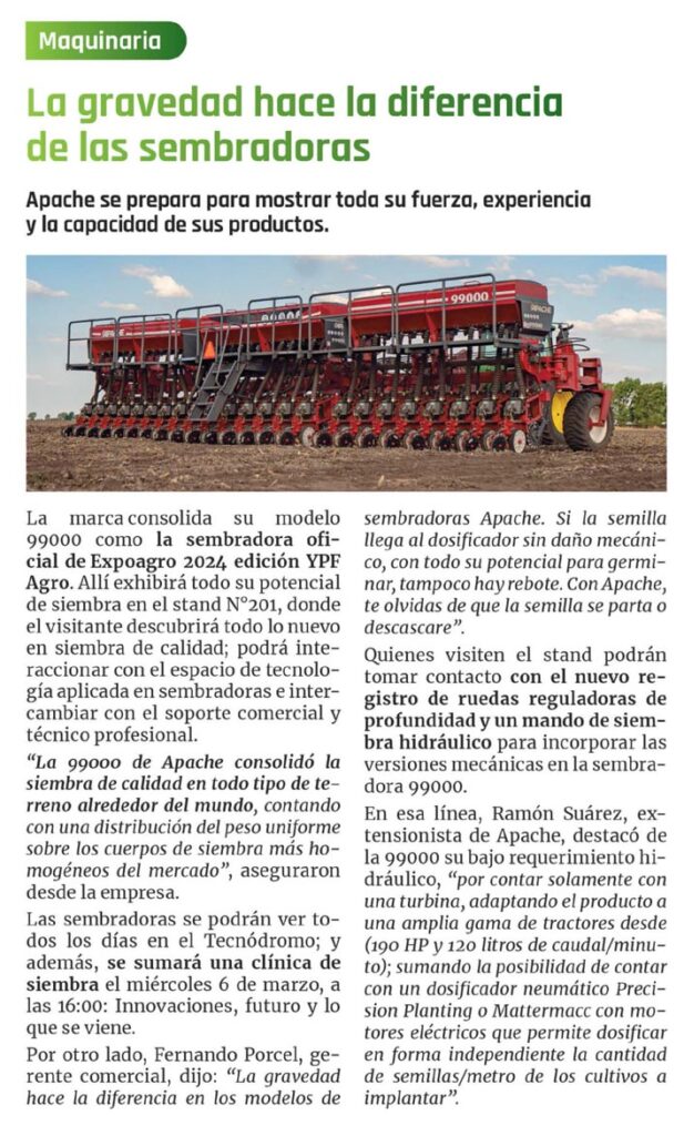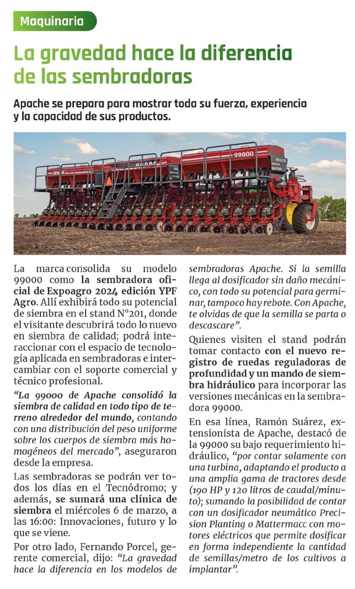 «La 99000 de Apache consolidó la siembra de calidad en todo tipo de terreno alrededor del mundo, contando con una distribución del peso uniforme sobre los cuerpos de siembra más homogéneos del mercado», aseguraron desde la empresa. Las sembradoras se podrán ver todos los días en el Tecnódromo; y además, se sumará una clínica de siembra el miércoles 6 de marzo, a las 16:00: Innovaciones, futuroylo que se viene. Por otro lado, Fernando Porcel, gerente comercial, dijo: «La gravedad hace la diferencia en los modelos de sembradoras Apache. Si la semilla llega al dosificador sin daño mecánico, con todo su potencial para germinar, tampoco hay rebote. Con Apache, te olvidas de que la semilla se parta o descascare».