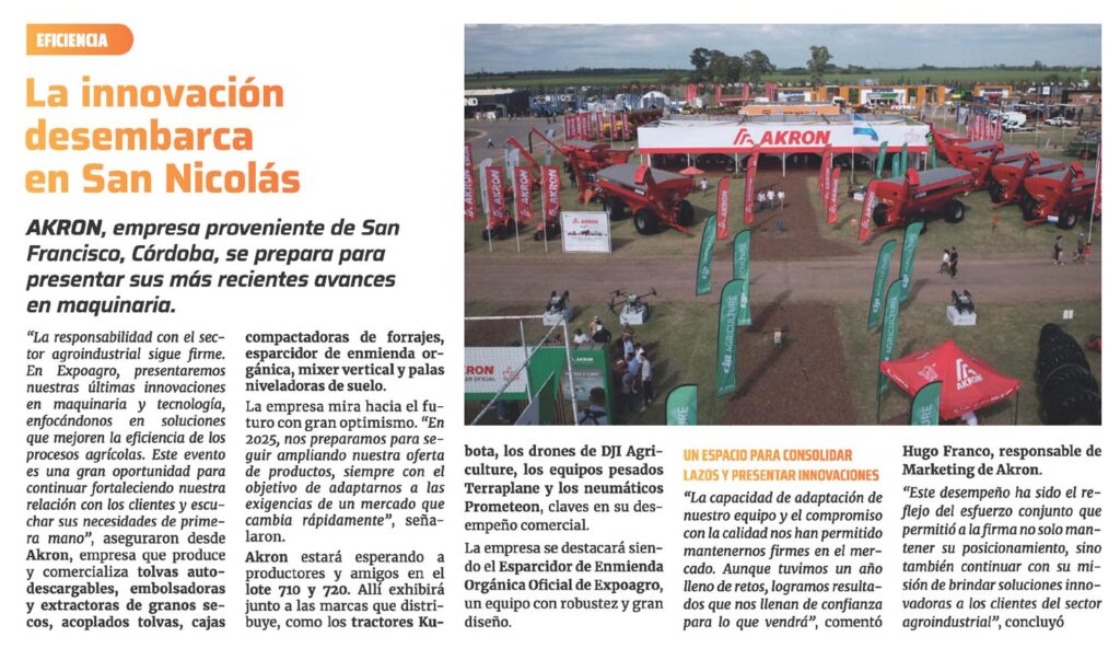 «La responsabilidad con el sector agroindustrial sigue firme. En Expoagro, presentaremos nuestras últimas innovaciones en maquinaria y tecnología, enfocándonos en soluciones que mejoren la eficiencia de los procesos agrícolas. Este evento es una gran oportunidad para continuar fortaleciendo nuestra relación con los clientes y escuchar sus necesidades de primera mano», aseguraron desde Akron, empresa que produce y comercializa tolvas auto- descargables, embolsadoras y extractoras de granos secos, acoplados tolvas, cajas compactadoras de forrajes, esparcidor de enmienda orgánica, mixer vertical y palas niveladoras de suelo.