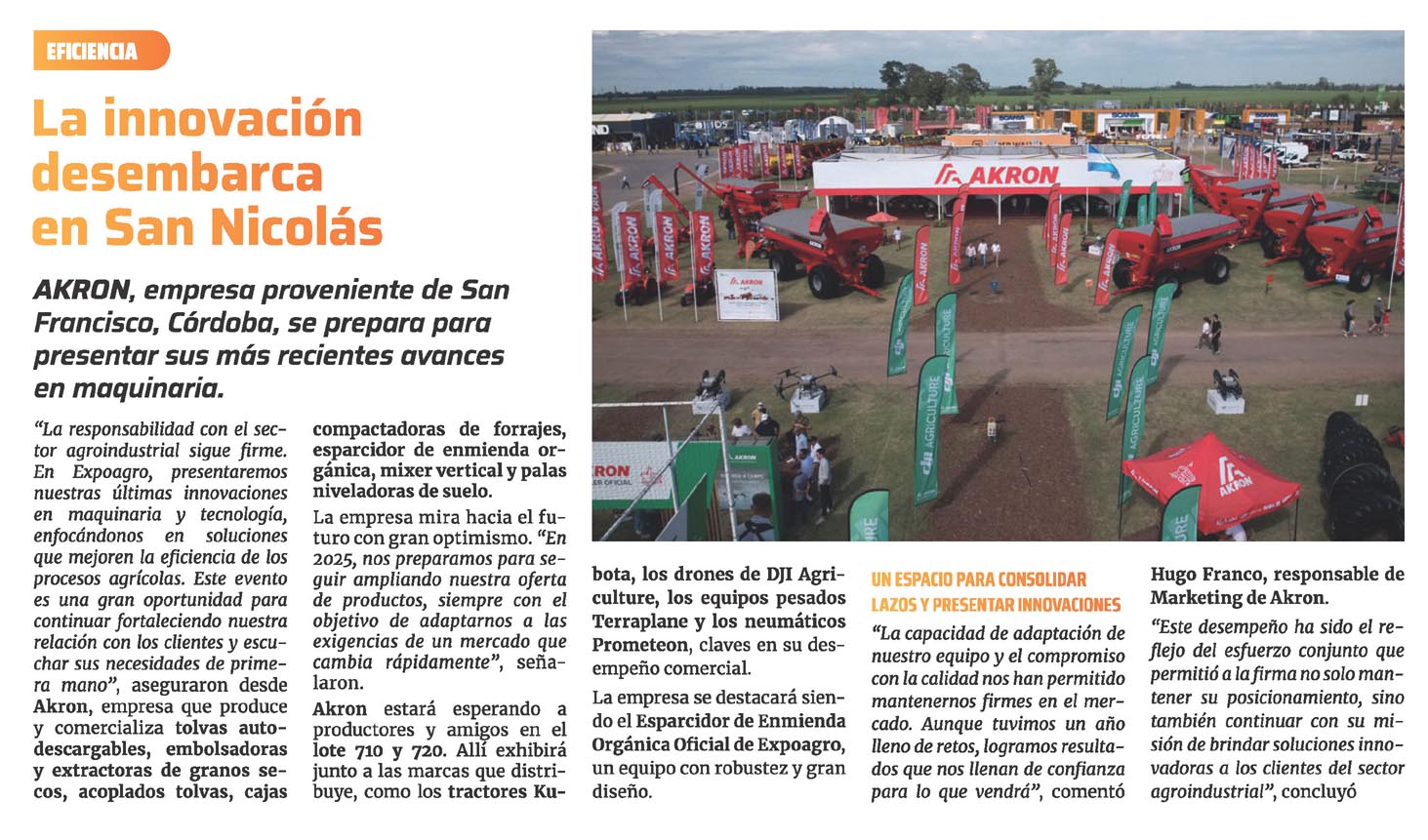 «La responsabilidad con el sector agroindustrial sigue firme. En Expoagro, presentaremos nuestras últimas innovaciones en maquinaria y tecnología, enfocándonos en soluciones que mejoren la eficiencia de los procesos agrícolas. Este evento es una gran oportunidad para continuar fortaleciendo nuestra relación con los clientes y escuchar sus necesidades de primera mano», aseguraron desde Akron, empresa que produce y comercializa tolvas auto- descargables, embolsadoras y extractoras de granos secos, acoplados tolvas, cajas compactadoras de forrajes, esparcidor de enmienda orgánica, mixer vertical y palas niveladoras de suelo.