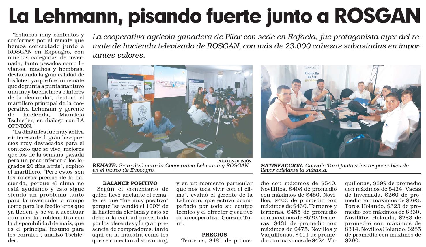 «Estamos muy contentos y conformes por el remate que hemos concretado junto a ROSGAN en Expoagro, con muchas categorías de invernada, tanto pesados como livianos, machos y hembras, destacando la gran calidad de los lotes, ya que fue un remate que de punta a punta mantuvo una muy buena línea e interés de la demanda», destacó el martillero principal de la cooperativa Lehmann y gerente de hacienda, Mauricio Tschieder, en diálogo con LA OPINIÓN.