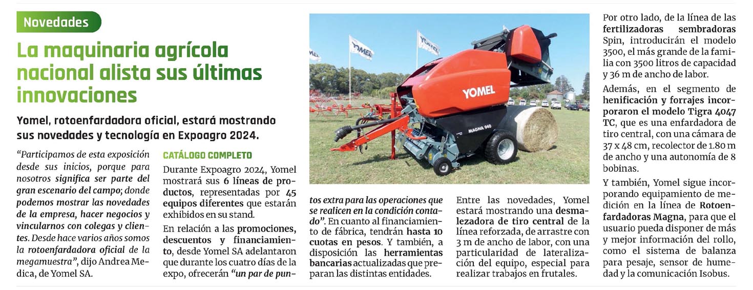 CATÁLOGO COMPLETO Durante Expoagro 2024, Yomel mostrará sus 6 líneas de productos, representadas por 45 equipos diferentes que estarán exhibidos en su stand.