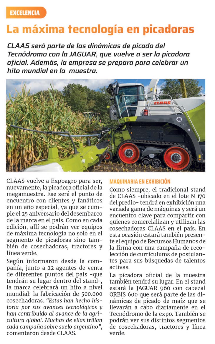 CLAAS vuelve a Expoagro para ser, nuevamente, la picadora oficial de la megamuestra. Ese será el punto de encuentro con clientes y fanáticos en un año especial, ya que se cumple el 25 aniversario del desembarco de la marca en el país. Como en cada edición, allí se podrán ver equipos de máxima tecnología no solo en el segmento de picadoras sino también de cosechadoras, tractores y línea verde.