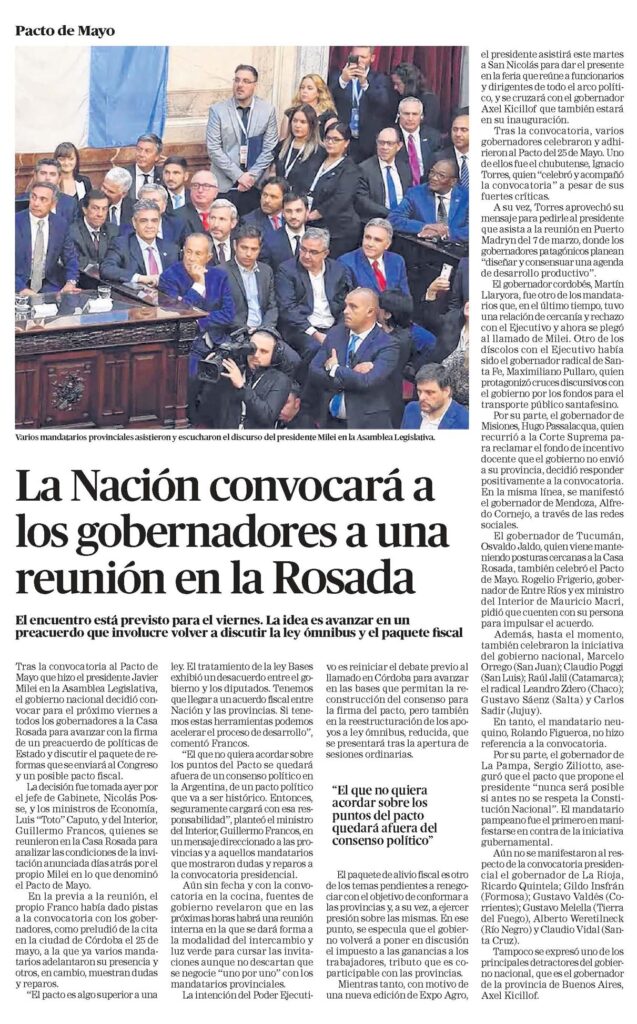 El encuentro está previsto para el viernes. La idea es avanzar en un preacuerdo que involucre volver a discutir la ley ómnibus y el paquete fiscalTras la convocatoria al Pacto de Mayo que hizo el presidente Javier Milei en la Asamblea Legislativa, el gobierno nacional decidió convocar para el próximo viernes a todos los gobernadores a la Casa Rosada para avanzar con la firma de un preacuerdo de políticas de Estado y discutir el paquete de reformas que se enviará al Congreso y un posible pacto fiscal.La decisión fue tomada ayer por el jefe de Gabinete, Nicolás Posse, y los ministros de Economía, Luis «Toto» Caputo, y del Interior, Guillermo Francos, quienes se reunieron en la Casa Rosada para analizar las condiciones de la invitación anunciada días atrás por el propio Milei en lo que denominó el Pacto de Mayo.En la previa a la reunión, el propio Franco había dado pistas a la convocatoria con los gobernadores, como preludió de la cita en la ciudad de Córdoba el 25 de mayo, a la que ya varios mandatarios adelantaron su presencia y otros, en cambio, muestran dudas y reparos.»El pacto es algo superior a una ley. El tratamiento de la ley Bases exhibió un desacuerdo entre el gobierno y los diputados. Tenemos que llegar a un acuerdo fiscal entre Nación y las provincias. Si tenemos estas herramientas podemos acelerar el proceso de desarrollo», comentó Francos.»El que no quiera acordar sobre los puntos del Pacto se quedará afuera de un consenso político en la Argentina, de un pacto político que va a ser histórico. Entonces, seguramente cargará con esa responsabilidad», planteó el ministro del Interior, Guillermo Francos, en un mensaje direccionado a las provincias y a aquellos mandatarios que mostraron dudas y reparos a la convocatoria presidencial.Aún sin fecha y con la convocatoria en la cocina, fuentes de gobierno revelaron que en las próximas horas habrá una reunión interna en la que se dará forma a la modalidad del intercambio y luz verde para cursar las invitaciones aunque no descartan que se negocie «uno por uno» con los mandatarios provinciales.La intención del Poder Ejecutivo es reiniciar el debate previo al llamado en Córdoba para avanzar en las bases que permitan la reconstrucción del consenso para la firma del pacto, pero también en la reestructuración de los apoyos a ley ómnibus, reducida, que se presentará tras la apertura de sesiones ordinarias.El paquete de alivio fiscal es otro de los temas pendientes a renegociar con el objetivo de conformar a las provincias y, a su vez, a ejercer presión sobre las mismas. En ese punto, se especula que el gobierno volverá a poner en discusión el impuesto a las ganancias a los trabajadores, tributo que es coparticipable con las provincias.Mientras tanto, con motivo de una nueva edición de Expo Agro el presidente asistirá este martes a San Nicolás para dar el presente en la feria que reúne a funcionarios y dirigentes de todo el arco político, y se cruzará con el gobernador Axel Kicillof que también estará en su inauguración.Tras la convocatoria, varios gobernadores celebraron y adhirieron al Pacto del 25 de Mayo. Uno de ellos fue el chubutense, Ignacio Torres, quien «celebró y acompañó la convocatoria» a pesar de sus fuertes críticas.A su vez, Torres aprovechó su mensaje para pedirle al presidente que asista a la reunión en Puerto Madryn del 7 de marzo, donde los gobernadores patagónicos planean «diseñar y consensuar una agenda de desarrollo productivo».El gobernador cordobés, Martín Llaryora, fue otro de los mandatarios que, en el último tiempo, tuvo una relación de cercanía y rechazo con el Ejecutivo y ahora se plegó al llamado de Milei. Otro de los díscolos con el Ejecutivo había sido el gobernador radical de Santa Fe, Maximiliano Pullaro, quien protagonizó cruces discursivos con el gobierno por los fondos para el transporte público santafesino.Por su parte, el gobernador de Misiones, Hugo Passalacqua, quien recurrió a la Corte Suprema para reclamar el fondo de incentivo docente que el gobierno no envió a su provincia, decidió responder positivamente a la convocatoria.En la misma línea, se manifestó el gobernador de Mendoza, Alfredo Cornejo, a través de las redes sociales.El gobernador de Tucumán, Osvaldo Jaldo, quien viene manteniendo posturas cercanas a la Casa Rosada, también celebró el Pacto de Mayo. Rogelio Frigerio, gobernador de Entre Ríos y ex ministro del Interior de Mauricio Macri, pidió que cuenten con su persona para impulsar el acuerdo.Además, hasta el momento, también celebraron la iniciativa del gobierno nacional, Marcelo Orrego (San Juan); Claudio Poggi (San Luis); Raúl Jalil (Catamarca); el radical Leandro Zdero (Chaco); Gustavo Sáenz (Salta) y Carlos Sadir (Jujuy).En tanto, el mandatario neuquino, Rolando Figueroa, no hizo referencia a la convocatoria.Por su parte, el gobernador de La Pampa, Sergio Ziliotto, aseguró que el pacto que propone el presidente «nunca será posible si antes no se respeta la Constitución Nacional». El mandatario pampeano fue el primero en manifestarse en contra de la iniciativa gubernamental.Aún no se manifestaron al respecto de la convocatoria presidencial el gobernador de La Rioja, Ricardo Quintela; Gildo Insfrán (Formosa); Gustavo Valdés (Corrientes); Gustavo Melella (Tierra del Fuego), Alberto Weretilneck (Río Negro) y Claudio Vidal (Santa Cruz).Tampoco se expresó uno de los principales detractores del gobierno nacional, que es el gobernador de la provincia de Buenos Aires, Axel Kicillof»El que no quieraacordar sobre lospuntos del pactoquedará afuera delconsenso político»Varios mandatarios provinciales asistieron y escucharon el discurso del presidente Milei en la Asamblea Legislativa
