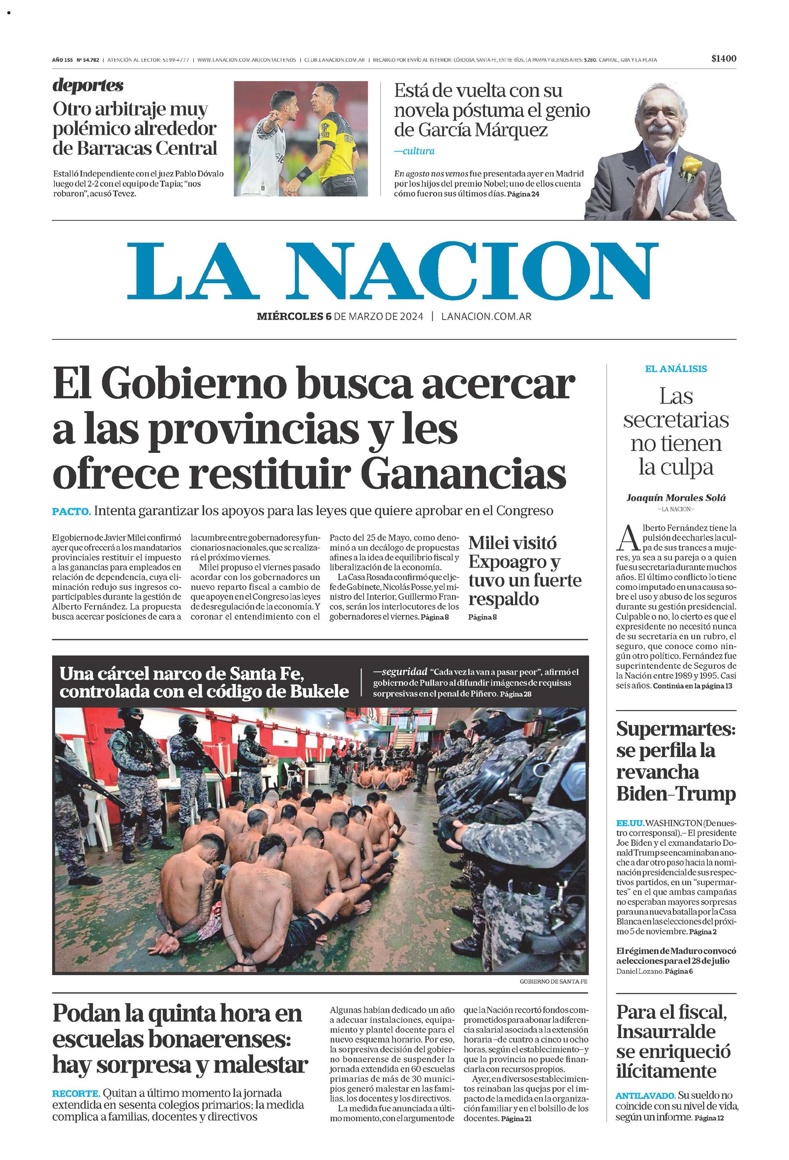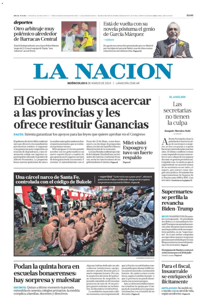 El Gobierno busca acercar a las provincias y les ofrece restituir Gananciaspacto. Intenta garantizar los apoyos para las leyes que quiere aprobar en el CongresoEl gobierno de Javier Milei confirmó ayer que ofrecerá a los mandatarios provinciales restituir el impuesto a las ganancias para empleados en relación de dependencia, cuya eliminación redujo sus ingresos co- participables durante la gestión de Alberto Fernández. La propuesta busca acercar posiciones de cara a la cumbre entre gobernadores y funcionarios nacionales, que se realizará el próximo viernes.Milei propuso el viernes pasado acordar con los gobernadores un nuevo reparto fiscal a cambio de que apoyen en el Congreso las leyes de desregulación de la economía. Y coronar el entendimiento con el Pacto del 25 de Mayo, como denominó a un decálogo de propuestas afines a la idea de equilibrio fiscal y liberalización de la economía.La Casa Rosada confirmó que elje- fe de Gabinete, Nicolás Posse, y el ministro del Interior, Guillermo Francos, serán los interlocutores de los gobernadores el viernes. Página 8Milei visitó Expoagro y tuvo un fuerte respaldoEL ANALISISLas secretarias no tienen la culpaJoaquín Morales Solá-LA NACION-Alberto Fernández tiene la pulsión de echarles la culpa de sus trances a mujeres, ya sea a su pareja o a quien fue su secretaria durante muchos años. El último conflicto lo tiene como imputado en una causa sobre el uso y abuso de los seguros durante su gestión presidencial. Culpable o no, lo cierto es que el expresidente no necesitó nunca de su secretaria en un rubro, el seguro, que conoce como ningún otro político. Fernández fue superintendente de Seguros de la Nación entre 1989 y 1995. Casi seis años. Continúa en la página 13Una cárcel narco de Santa Fe, controlada con el código de Bukele-seguridad «Cada vez la van a pasar peor», afirmó el gobierno de Pullaro al difundir imágenes de requisas sorpresivas en el penal de Piñero. Página 28Supermartes: se perfila la revancha Biden-TrumpEE.UU. WASHINGTON (De nuestro corresponsal).- El presidente Joe Biden y el exmandatario Do- nald Trump se encaminaban anoche a dar otro paso hacia la nominación presidencial de sus respectivos partidos, en un «supermartes» en el que ambas campañas no esperaban mayores sorpresas para una nueva batalla por la Casa Blanca en las elecciones del próximo 5 de noviembre. Página 2El régimen de Maduro convocó a elecciones para el 28 de julio Daniel Lozano. Página 6Para el fiscal, Insaurralde se enriqueció ilícitamenteAntilavado. Su sueldo no coincide con su nivel de vida, según un informe. Página 12Podan la quinta hora en escuelas bonaerenses: hay sorpresa y malestarRecorte. Quitan a último momento la jornada extendida en sesenta colegios primarios; la medida complica a familias, docentes y directivosAlgunas habían dedicado un año a adecuar instalaciones, equipamiento y plantel docente para el nuevo esquema horario. Por eso, la sorpresiva decisión del gobierno bonaerense de suspender la jornada extendida en 60 escuelas primarias de más de 30 municipios generó malestar en las familias, los docentes y los directivos.La medida fue anunciada a último momento, con el argumento de que la Nación recortó fondos comprometidos para abonar la diferencia salarial asociada a la extensión horaria -de cuatro a cinco u ocho horas, según el establecimiento- y que la provincia no puede financiarla con recursos propios.Ayer, en diversos establecimientos reinaban las quejas por el impacto de la medida en la organización familiar y en el bolsillo de los docentes. Página 21deportesOtro arbitraje muy polémico alrededor de Barracas CentralEstalló Independiente con el juez Pablo Dóvalo luego del 2-2 con el equipo de Tapia; «nos robaron», acusó Tevez.Está de vuelta con su novela postuma el genio de García Márquez-culturaEn agosto nos vemos fue presentada ayer en Madrid por los hijos del premio Nobel; uno de ellos cuenta cómo fueron sus últimos días. Página 24