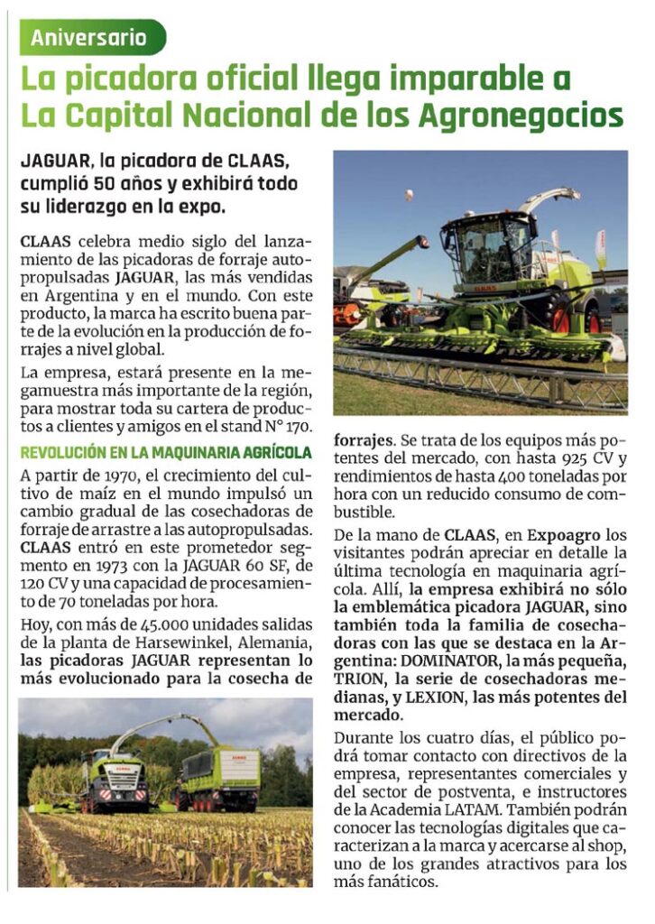 JAGUAR, la picadora de CLAAS, cumplió 50 años y exhibirá todo su liderazgo en la expo.CLAAS celebra medio siglo del lanzamiento de las picadoras de forraje autopropulsadas JAGUAR, las más vendidas en Argentina y en el mundo. Con este producto, la marca ha escrito buena parte de la evolución en la producción de forrajes a nivel global.La empresa, estará presente en la megamuestra más importante de la región, para mostrar toda su cartera de productos a clientes y amigos en el stand N° 170.REVOLUCIÓN EN LA MAQUINARIA AGRÍCOLA A partir de 1970, el crecimiento del cultivo de maíz en el mundo impulsó un cambio gradual de las cosechadoras de forraje de arrastre alas autopropulsadas. CLAAS entró en este prometedor segmento en 1973 con la JAGUAR 60 SF, de 120 CV y una capacidad de procesamiento de 70 toneladas por hora.Hoy, con más de 45.000 unidades salidas de la planta de Harsewinkel, Alemania, las picadoras JAGUAR representan lo más evolucionado para la cosecha de forrajes. Se trata de los equipos más potentes del mercado, con hasta 925 CV y rendimientos de hasta 400 toneladas por hora con un reducido consumo de combustible.De la mano de CLAAS, en Expoagro los visitantes podrán apreciar en detalle la última tecnología en maquinaria agrícola. Allí, la empresa exhibirá no sólo la emblemática picadora JAGUAR, sino también toda la familia de cosechadoras con las que se destaca en la Argentina: DOMINATOR, la más pequeña, TRION, la serie de cosechadoras medianas, y LEXION, las más potentes del mercado.Durante los cuatro días, el público podrá tomar contacto con directivos de la empresa, representantes comerciales y del sector de postventa, e instructores de la Academia LATAM. También podrán conocer las tecnologías digitales que caracterizan a la marca y acercarse al shop, uno de los grandes atractivos para los más fanáticos.