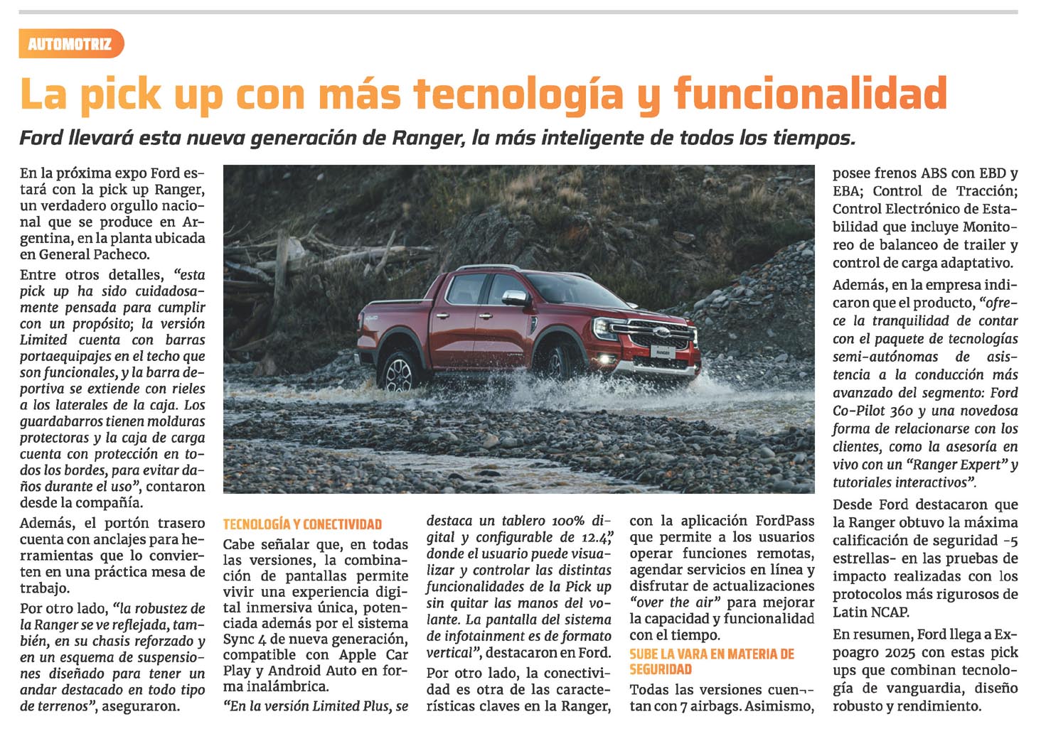 En la próxima expo Ford estará con la pick up Ranger, un verdadero orgullo nacional que se produce en Argentina, en la planta ubicada en General Pacheco.