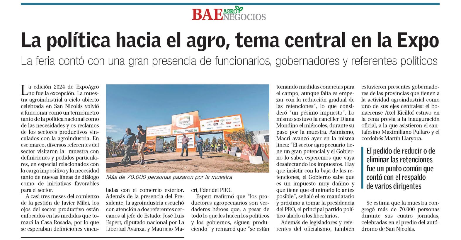 La feria contó con una gran presencia de funcionarios, gobernadores y referentes políticosLa edición 2024 de ExpoAgro no fue la excepción. La muestra agroindustrial a cielo abierto celebrada en San Nicolás volvió a funcionar como un termómetro tanto de la política nacional como de las necesidades y os reclamos de los sectores productivos vinculados con la agroindustria. En ese marco, diversos referentes del sector visitaron la muestra con definiciones y pedidos particulares, en especial relacionados con la carga impositiva y la necesidad tanto de nuevas líneas de diálogo como de iniciativas favorables para el sector.A casi tres meses del comienzo de la gestión de Javier Milei, los ojos del sector productivo están enfocados en las medidas que tomará la Casa Rosada, por lo que se esperaban definiciones vinculadas con el comercio exterior.Además de la presencia del Presidente, la agroindustria escuchó con atención a dos referentes cercanos al jefe de Estado: José Luis Espert, diputado nacional por La Libertad Avanza, y Mauricio Macri, líder del PRO.Espert reafirmó que «los productores agropecuarios son verdaderos héroes que, a pesar de todo lo que les hacen los políticos y los gobiernos, siguen produciendo» y remarcó que «se están tomando medidas concretas para el campo, aunque falta es empezar con la reducción gradual de las retenciones», lo que consideró «un pésimo impuesto». Lo mismo sostuvo la canciller Diana Mondino el miércoles, durante su paso por la muestra. Asimismo, Macri avanzó ayer en la misma línea: «El sector agropecuario tiene un gran potencial y el Gobierno lo sabe, esperemos que vaya desafectando los impuestos. Hay que insistir con la baja de las retenciones, el Gobierno sabe que es un impuesto muy dañino y que tiene que eliminarlo lo antes posible», señaló el ex mandatario y próximo a tomar la presidencia del PRO, el principal partido político aliado a los libertarios.Además de legisladores y referentes del oficialismo, también estuvieron presentes gobernadores de las provincias que tienen a la actividad agroindustrial como uno de sus ejes centrales: el bonaerense Axel Kicillof estuvo en la cena previa a la inauguración oficial, a la que asistieron el santafesino Maximiliano Pullaro y el cordobés Martín Llaryora.Se estima que la muestra congregó más de 70.000 personas durante sus cuatro jornadas, celebradas en el predio del autódromo de San Nicolás.El pedido de reducir o de eliminar las retenciones fue un punto común que contó con el respaldo de varios dirigentesMás de 70.000 personas pasaron por la muestraMenciones: cpol2