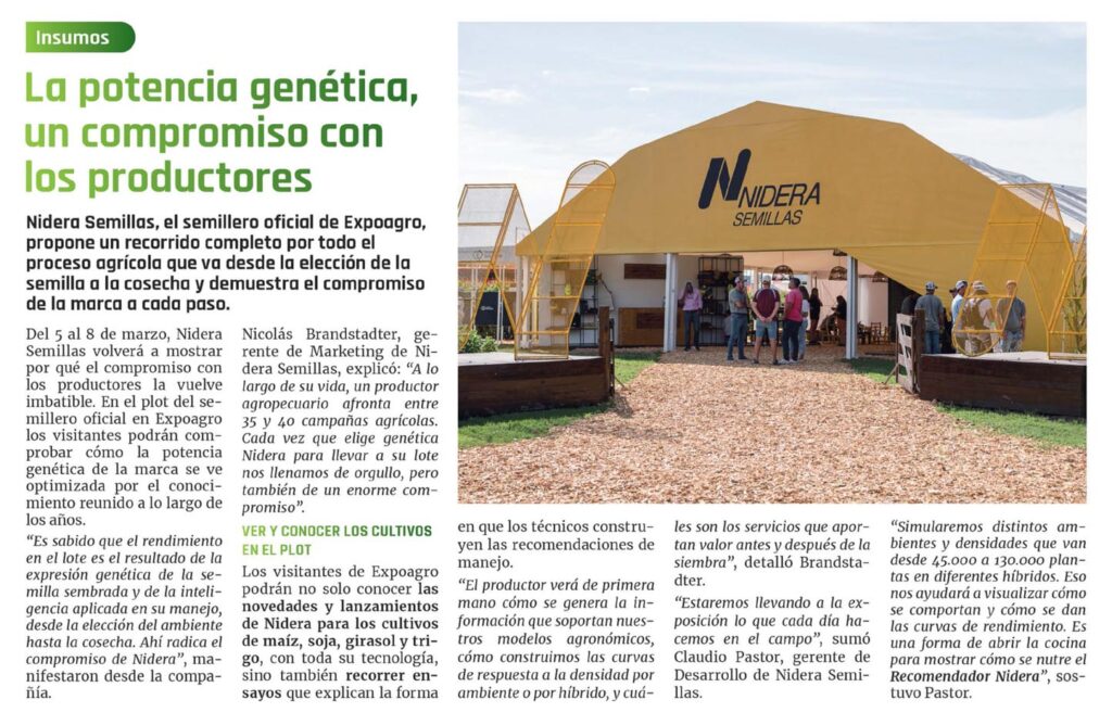 Del 5 al 8 de marzo, Nidera Semillas volverá a mostrar por qué el compromiso con los productores la vuelve im- batible. En el plot del semillero oficial en Expoagro los visitantes podrán comprobar cómo la potencia genética de la marca se ve optimizada por el conocimiento reunido a lo largo de los años.
