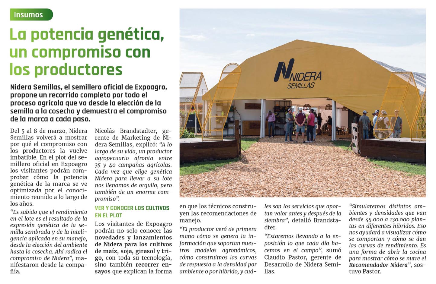 «El productor verá de primera mano cómo se genera la información que soportan nuestros modelos agronómicos, cómo construimos las curvas de respuesta a la densidad por ambiente o por híbrido, y cuáles son los servicios que aportan valor antes y después de la siembra», detalló Brandstadter. «Estaremos llevando a la exposición lo que cada día hacemos en el campo», sumó Claudio Pastor, gerente de Desarrollo de Nidera Semillas.