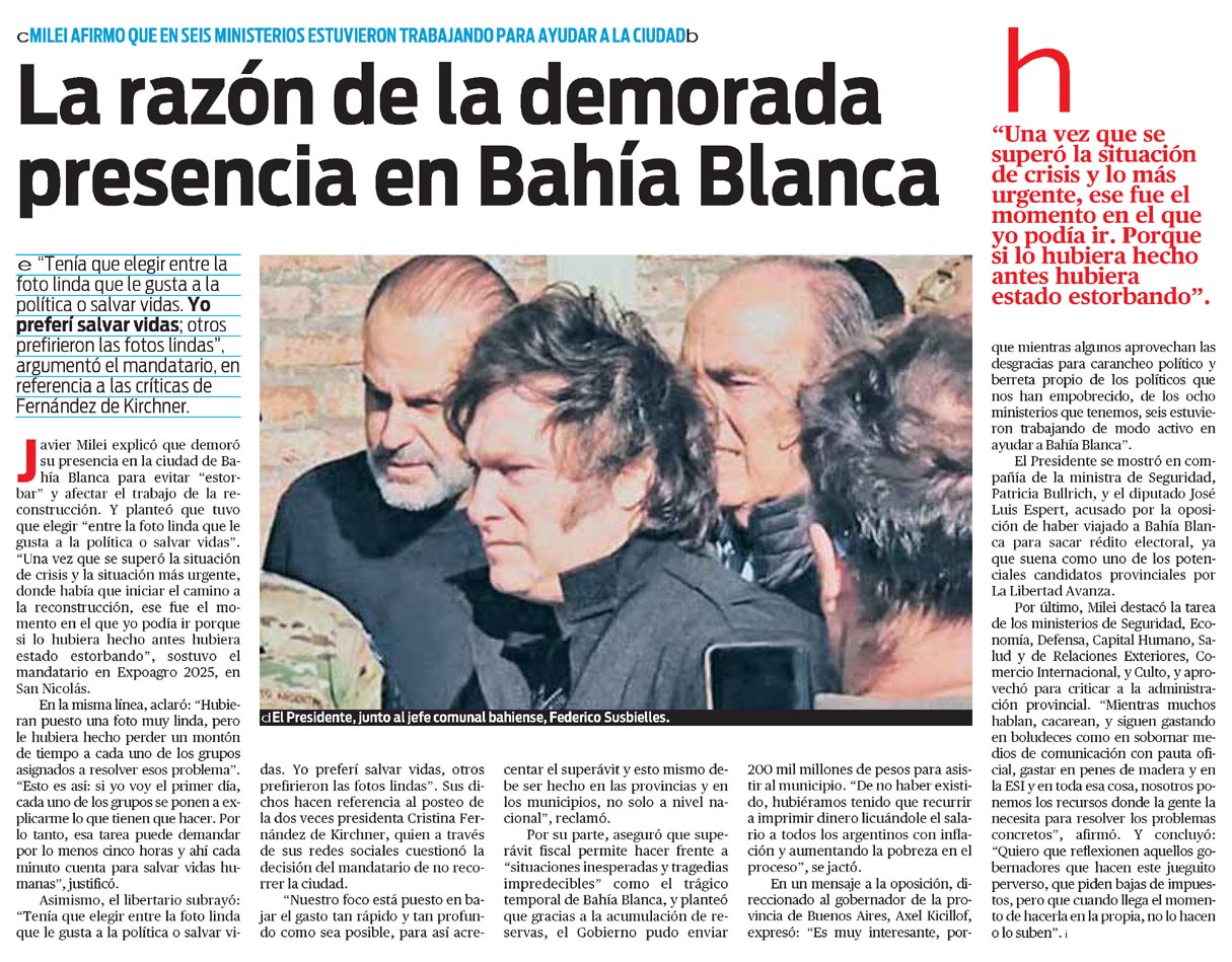 … camino a la reconstrucción, ese fue el momento en el que yo podía ir porque si lo hubiera hecho antes hubiera estado estorbando», sostuvo el mandatario en Expoagro 2025, en San Nicolás. En la misma línea, aclaró: «Hubieran puesto una foto muy linda, pero le hubiera hecho perder un montón de tiempo a cada uno de los…