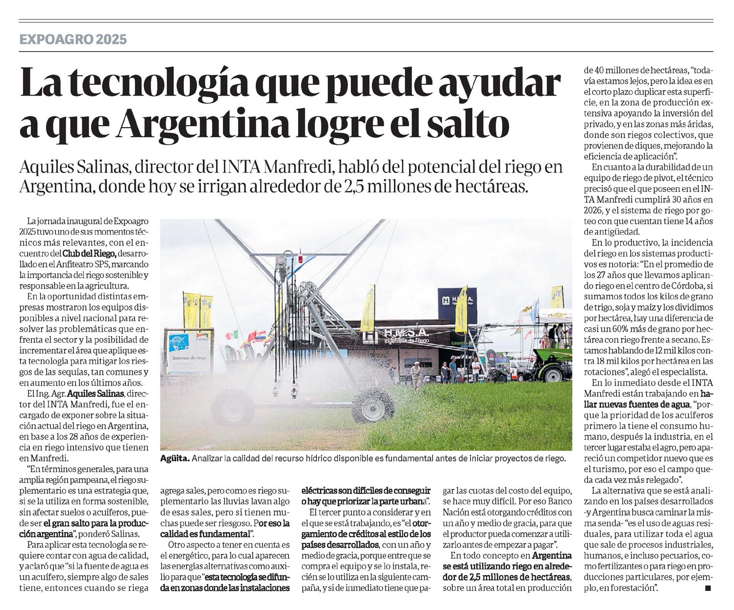 Aquiles Salinas, director del INTA Manfredi, habló del potencial del riego en Argentina, donde hoy se irrigan alrededor de 2,5 millones de hectáreas.