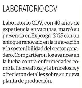 Laboratorio CDV, con 40 años de experiencia en vacunas, marcó su presencia en Expoagro 2025 con un enfoque renovado en la innovación y la sostenibilidad del sector ganadero. Compartieron los avances en la lucha contra enfermedades como la…
