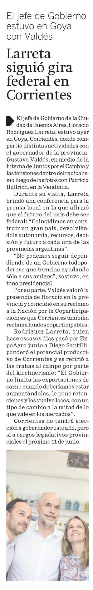 El jefe de Gobierno de la Ciudad de Buenos Aires, Horacio Rodríguez Larreta, estuvo ayer en Goya, Corrientes, donde compartió distintas actividades con el gobernador de la provincia, Gustavo Valdés, en medio de la interna de Juntos por el Cambio y las tensiones dentro del radicalismo luego de las fotos con Patricia Bullrich, en la Vendimia.