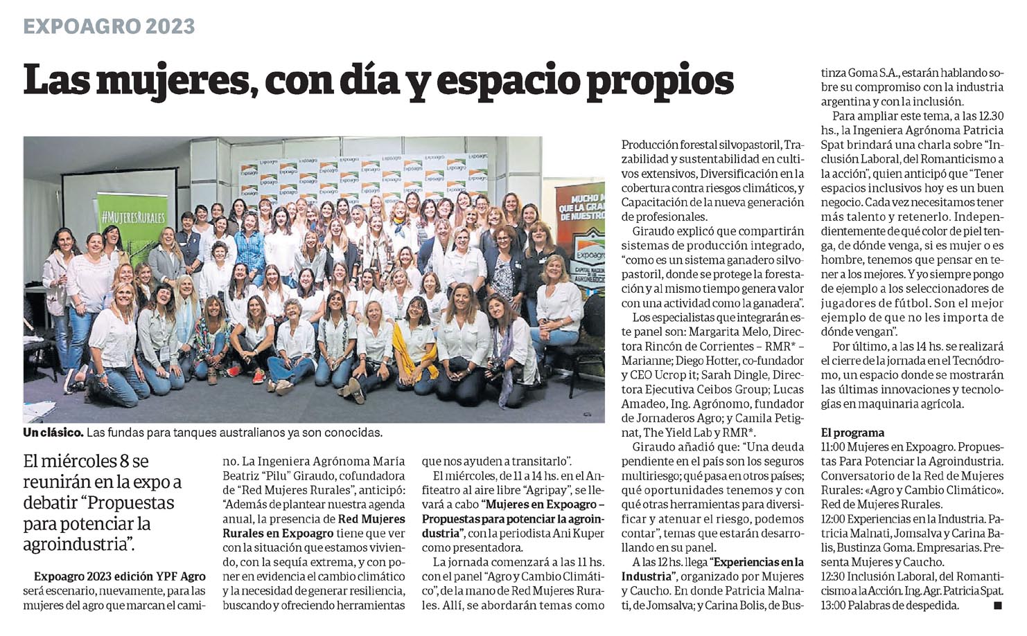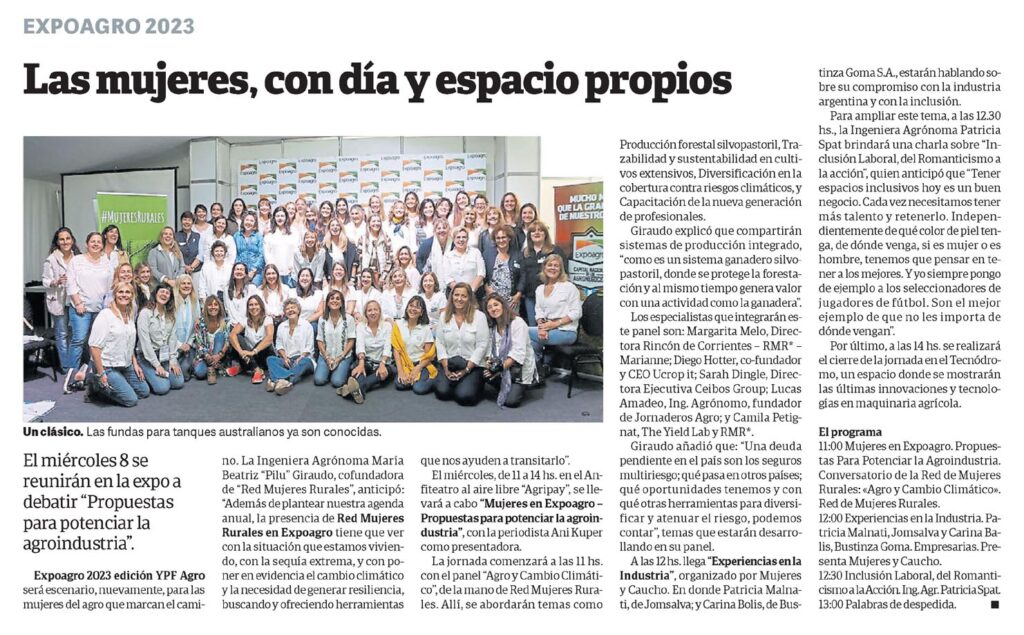Expoagro 2023 edición YPF Agro será escenario, nuevamente, para las mujeres del agro que marcan el cami- no. La Ingeniera Agrónoma María Beatriz «Pilu» Giraudo, cofundadora de «Red Mujeres Rurales», anticipó: «Además de plantear nuestra agenda anual, la presencia de Red Mujeres Rurales en Expoagro tiene que ver con la situación que estamos viviendo, con la sequía extrema, y con poner en evidencia el cambio climático y la necesidad de generar resiliencia, buscando y ofreciendo herramientas que nos ayuden a transitarlo».