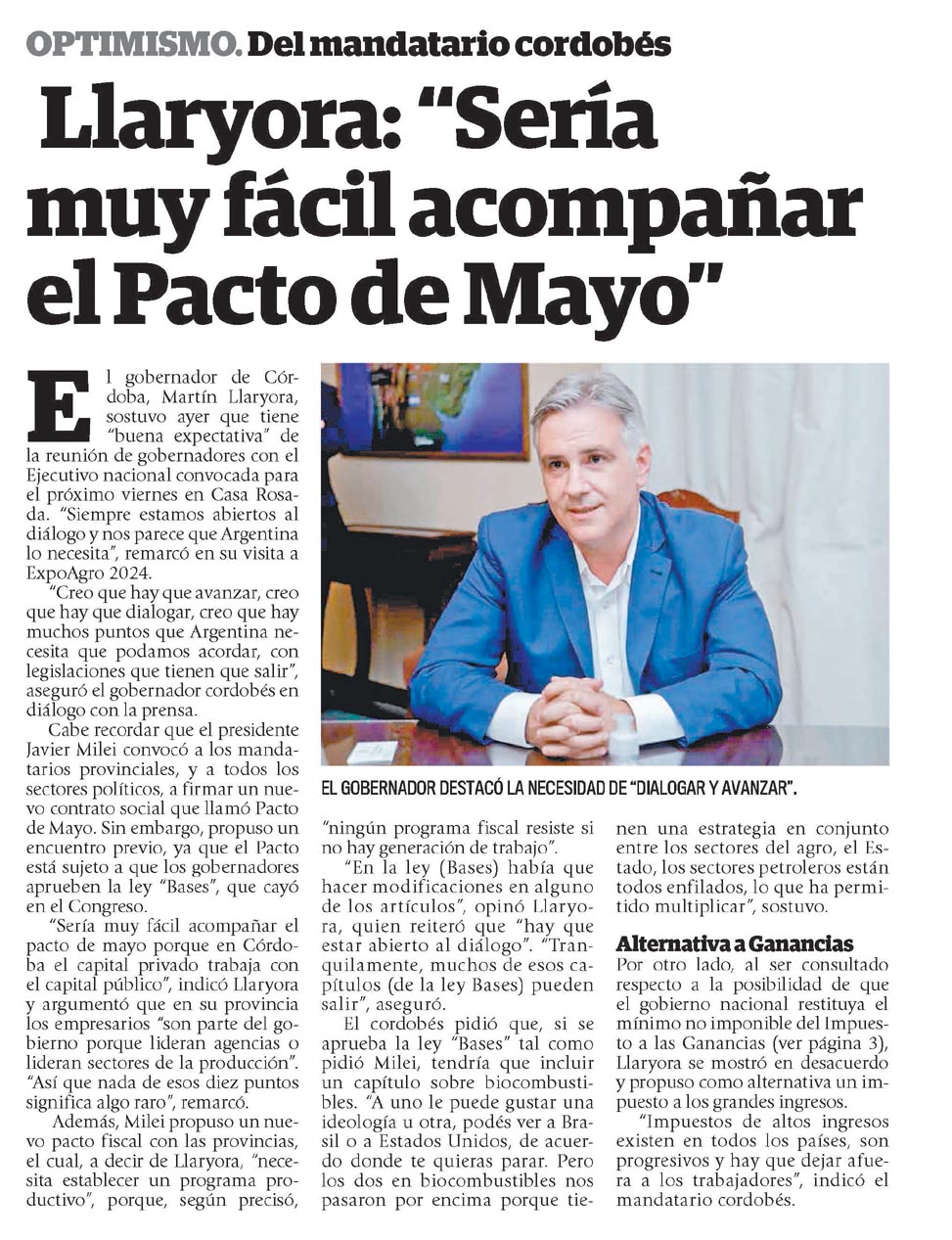 Alternativa a Ganancias Por otro lado, al ser consultado respecto a la posibilidad de que el gobierno nacional restituya el mínimo no imponible del Impuesto a las Ganancias (ver página 3), Llaryora se mostró en desacuerdo y propuso como alternativa un impuesto a los grandes ingresos.