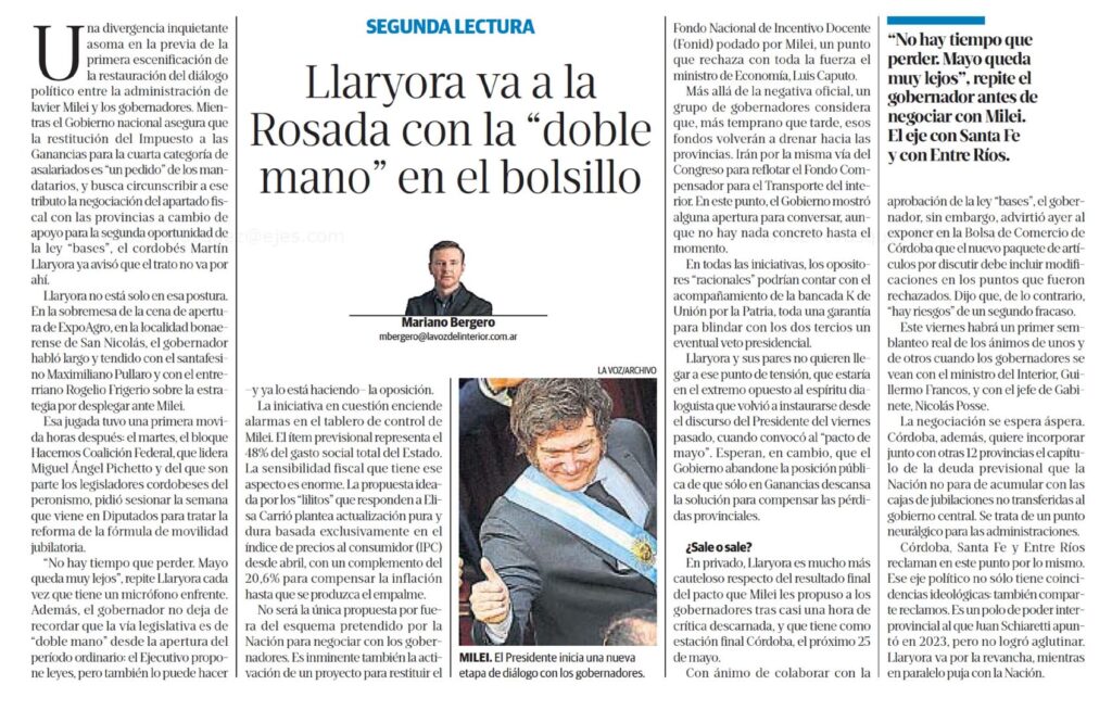 Una divergencia inquietante asoma en la previa de la primera escenificación de la restauración del diálogo político entre la administración de Javier Milei y los gobernadores. Mientras el Gobierno nacional asegura que la restitución del Impuesto a las Ganancias para la cuarta categoría de asalariados es «un pedido» de los mandatarios, y busca circunscribir a ese tributo la negociación del apartado fiscal con las provincias a cambio de apoyo para la segunda oportunidad de la ley «bases», el cordobés Martín Llaryora ya avisó que el trato no va por ahí.Llaryora no está solo en esa postura. En la sobremesa de la cena de apertura de ExpoAgro, en la localidad bonaerense de San Nicolás, el gobernador habló largo y tendido con el santafesi- no Maximiliano Pullaro y con el entre- rriano Rogelio Frigerio sobre la estrategia por desplegar ante Milei.Esa jugada tuvo una primera movida horas después; el martes, el bloque Hacemos Coalición Federal, que lidera Miguel Angel Pichetto y del que son parte los legisladores cordobeses del peronismo, pidió sesionar la semana que viene en Diputados para tratar la reforma de la fórmula de movilidad jubilatoria.«No hay tiempo que perder. Mayo queda muy lejos», repite Llaryora cada vez que tiene un micrófono enfrente. Además, el gobernador no deja de recordar que la vía legislativa es de «doble mano» desde la apertura del período ordinario: el Ejecutivo propone leyes, pero también lo puede hacer -y ya lo está haciendo- la oposición.La iniciativa en cuestión enciende alarmas en el tablero de control de Milei. El ítem provisional representa el 48% del gasto social total del Estado. La sensibilidad fiscal que tiene ese aspecto es enomie. La propuesta ideada por los «lilitos» que responden a Elisa Garrió plantea actualización pura y dura basada exclusivamente en el índice de precios al consumidor (IPC) desde abril, con un complemento del 20,6% para compensar la inflación hasta que se produzca el empalme.No será la única propuesta por fuera del esquema pretendido por la Nación para negociar con los gobernadores. Es inminente también la activación de un proyecto para restiúiir el Fondo Nacional de Incentivo Docente (Fonid) podado por Milei, un punto que rechaza con toda la fuerza el ministro de Economía. Luis Caputo.Más allá de la negativa oficial, un grupo de gobernadores considera que, más temprano que tarde, esos fondos volverán a drenar hacia las provincias. Irán por la misma vía del Congreso para reflotar el Fondo Compensador para el Transporte del interior. En este punto, el Gobierno mostró alguna apertura para conversar, aunque no hay nada concreto hasta el momento.En todas las iniciativas, los opositores «racionales» podrían contar con el acompañamiento de la bancada K de Unión por la Patria, toda una garantía para blindar con los dos tercios un evenúial veto presidencial.Llaryora y sus pares no quieren llegar a ese punto de tensión, que estaría en el extremo opuesto al espírim dia- loguista que volvió a instaurarse desde el discurso del Presidente del viernes pasado, cuando convocó al «pacto de mayo». Esperan, en cambio, que el Gobierno abandone la posición pública de que sólo en Ganancias descansa la solución para compensar las pérdidas provinciales.¿Sale o sale? En privado, Llary ora es mucho más cauteloso respecto del resultado final del pacto que Milei les propuso a los gobernadores tras casi una hora de crítica descarnada, y que tiene como estación final Córdoba, el próximo 25 de mayo.Con ánimo de colaborar con la aprobación de la ley «bases», el gobernador, sin embargo, advirtió ayer al exponer en la Bolsa de Comercio de Córdoba que el nuevo paquete de artículos por discutir debe incluir modificaciones en los puntos que fueron rechazados. Dijo que, de lo contrario, «hay riesgos» de un segundo fracaso.Este viernes habrá un primer semblanteo real de los ánimos de unos y de otros cuando los gobernadores se vean con el ministro del Interior, Guillermo Francos, y con el jefe de Gabinete, Nicolás Posse.La negociación se espera áspera. Córdoba, además, quiere incorporar junto con otras 12 provincias el capítulo de la deuda previsional que la Nación no para de acumular con las cajas de jubilaciones no transferidas al gobierno central. Se trata de un punto neurálgico para las administraciones.Córdoba, Santa Fe y Entre Píos reclaman en este punto por lo mismo. Ese eje político no sólo tiene coincidencias ideológicas: también comparte redamos. Es un polo de poder interprovincial al que Juan Schiaretti apuntó en 2023, pero no logró aglutinar. Llaryora va por la rev ancha, mientras en paralelo puja con la Nación.