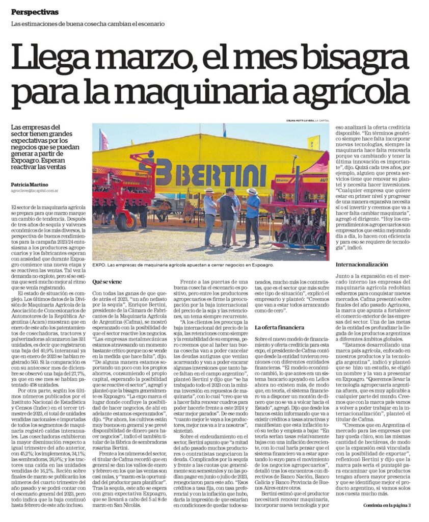Las empresas del sector tienen grandes expectativas por los negocios que se puedan generar a partir de Expoagro. Esperan reactivar las ventasEl sector de la maquinaria agrícola se prepara para que marzo marque un cambio de tendencia. Después de tres años de sequía y vaivenes económicos de los más diversos, la perspectiva de buenos rendimientos para la campaña 2023/24 entusiasma a los productores agropecuarios y los fabricantes esperan con ansiedad que durante Expoagro comience una nueva etapa y se reactiven las ventas. Tal vez la demanda no explote, pero sí se estima que será mucho mejor al ritmo que se venía registrando.El estado de situación es complejo.Los últimos datos de la División de Maquinaria Agrícola de la Asociación de Concesionarios de Automotores de la República Argentina (Acara) muestran que en enero de este año los patentamientos de cosechadoras, tractores y pulverizadoras alcanzaron las 331 unidades, es decir que registraron una baja del 40,9% interanual ya que en enero de 2023 se habían registrado 560. Si la comparación es con su antecesor mes de diciembre se observó una baja del 27,7%, ya que en ese mes se habían patentado 458 unidades.Por otra parte, según los últimos números publicados por el Instituto Nacional de Estadística y Censos (Indec) en el tercer trimestre de 2023, el total de unidades vendidas nacionales e importadas de todos los segmentos de maquinaria registró caídas interanuales.Las cosechadoras exhibieron la mayor disminución respecto a igual trimestre del año anterior, con 45,2%; los implementos, 34,1%; las sembradoras, 26,9%; y los tractores una caída en las unidades vendidas de 16,2%. Recién sobre finales de marzo se publicarán los números del cuarto trimestre del año pasado y se podrá contar con el escenario general del 2023, pero todo indica que la baja continuó hasta febrero de este año incluso.Qué se viene Con todas las ganas de que quede atrás el 2023, «un año nefasto por la sequía», Enrique Bertini, presidente de la Cámara de Fabricantes de la Maquinaria Agrícola de Argentina (Cafma), se mostró esperanzado con la posibilidad de que el sector reactive los negocios.»Las empresas metalmecánicas estamos atravesando un momento bastante crítico porque no se vende en la medida que hace falta», dijo.»De alguna manera estamos soportando un poco con los propios ahorros, consumiendo el propio capital, esperando la posibilidad que se reactive el sector», agregó y planteó que la bisagra generalmente es Expoagro. «La expo marca el lugar donde confluye la posibilidad de hacer negocios, de ahí en adelante estamos esperanzados», dijo. «Por ahora, los cultivos están muy buenos en general y se prevé disponibilidad de dinero para hacer negocios», indicó el también titular de la fábrica de sembradoras rosarina Bertini.Frente a los números del sector, el titular de Cafma recordó que en general se dan los valles de enero y febrero en los que las ventas son casi nulas, y «marzo es la oportunidad del productor para planificar».Tras la sequía, este año se espera con gran expectativa Expoagro, que se llevará a cabo del 5 al 8 de marzo en San Nicolás.Frente a las puertas de una buena cosecha el escenario es positivo, pero entre los productores agropecuarios es firme la preocupación por la baja internacional del precio de la soja y las retenciones, un tema siempre recurrente.»A los clientes les preocupa la baja internacional del precio de la soja, las retenciones como siempre y la rentabilidad de su empresa, pero creemos que al haber tan buena cosecha van a poder cancelar las deudas antiguas que venían acarreando y van a poder encarar algunas inversiones que tanto hace faltan en el campo argentino», planteó Bertini y dijo que «se ha trabajado todo el 2023 con la mínima inversión en repuestos de maquinaria», con lo cual «creo que va a hacer falta renovar cuadros para poder hacerle frente a este 2024 y estar mejor parados». De ese modo «cuanto mejor le vaya a los productores, mejor nos va a ir a nosotros», sintetizó.Sobre el endeudamiento en el sector, Bertini apunto que «a mitad del año pasado muchos productores o contratistas negociaron la deuda. Complicados por la sequía y frente a las cuotas que generalmente son semestrales y no las podían pagar en junio o julio de 2023, renegociaron para este año. «Esos créditos a tasa fija, con tasa preferencial y con la inflación que hubo, daría la impresión de que estarían en condiciones de quedar todos saneados, mucho más los contratistas, que es el sector que más sufre este tipo de situación», explicó el empresario y planteó: «Creemos que van a estar todos arrancando como de cero».La oferta financiera Sobre el nuevo modelo de financiamiento y oferta crediticia para esta expo, el presidente de Cafma contó que desde la entidad tuvieron reuniones con diferentes entidades financieras. «El modelo económico cambió, lo que antes era un sistema bancario apoyado en Lelics ahora no existen más, de modo que, en teoría, el sistema financiero va a disponer un montón de dinero que no se va a volcar hacia el Estado», agregó. Dijo que desde los bancos están informando que va a existir créditos a tasas atractivas y manifiestan que esta inflación tocó su techo y empieza a bajar. «En teoría serían tasas relativamente bajas con una inflación decreciente, con lo cual haría pensar que el sistema financiero va a estar aportando lo suyo para el movimiento de los negocios agropecuarios», detalló tras los encuentros con directivos de Banco Nación, Banco Galicia y Banco Provincia de Buenos Aires entre otros.Bertini estimó que el productor necesitará renovar maquinaria, incorporar nueva tecnología y por Si bien para el titular de Cafma faltan acomodar algunas variables para que las operaciones de comercio exterior sean convenientes para las empresas, porque la industria nacional está entre un 20% y 30% arriba en los costos respecto 