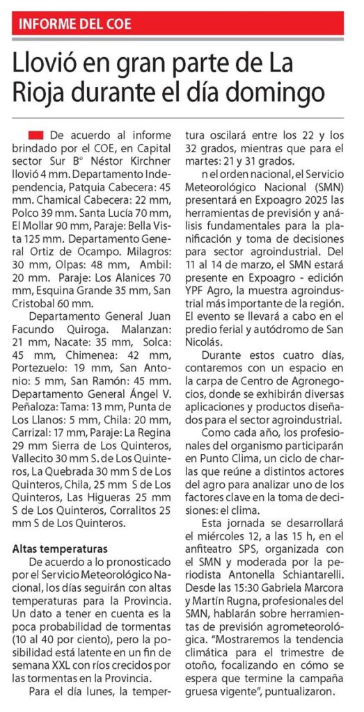 En el orden nacional, el Servicio Meteorológico Nacional (SMN) presentará en Expoagro 2025 las herramientas de previsión y análisis fundamentales para la planificación y toma de decisiones para el sector agroindustrial. Del 11 al 14 de marzo, el SMN estará presente en Expoagro – edición YPF Agro, la muestra agroindustrial más importante de la región. El evento se llevará a cabo en el predio ferial y autódromo de San Nicolás.