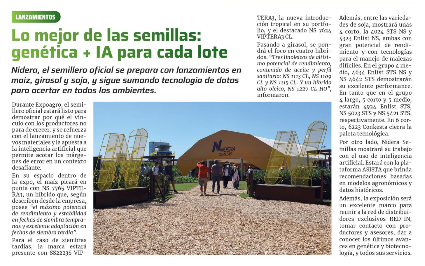 Por otro lado, Nidera Semillas mostrará su trabajo con el uso de inteligencia artificial. Estará con la plataforma ASISTA que brinda recomendaciones basadas en modelos agronómicos y datos históricos.