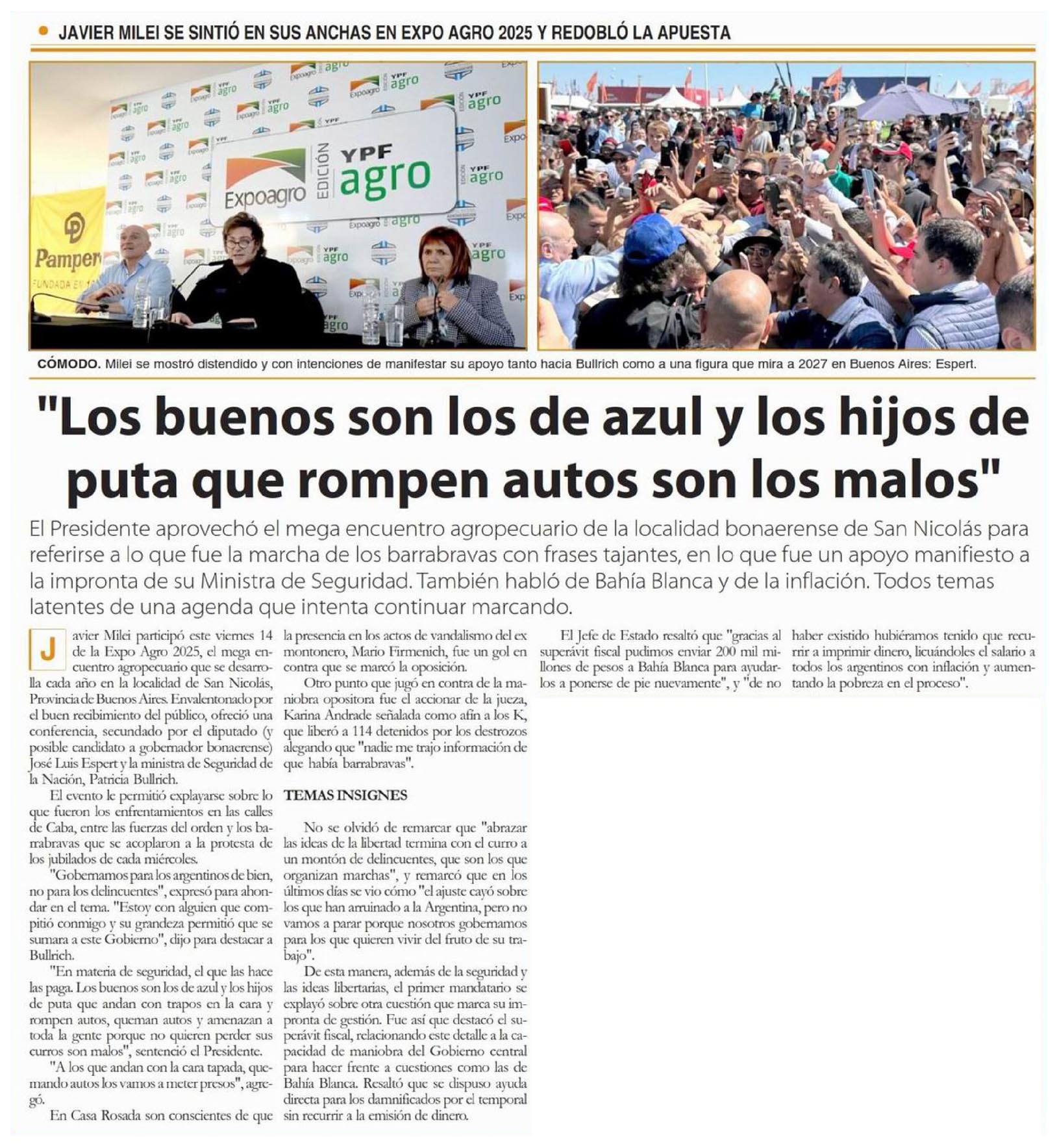 …Javier Milei se sintió en sus anchas en Expo Agro 2025 y redobló la apuesta. CÓMO. Milei se mostró distendido y con intenciones de manifestar su apoyo tanto a Patricia Bullrich como a una figura que…