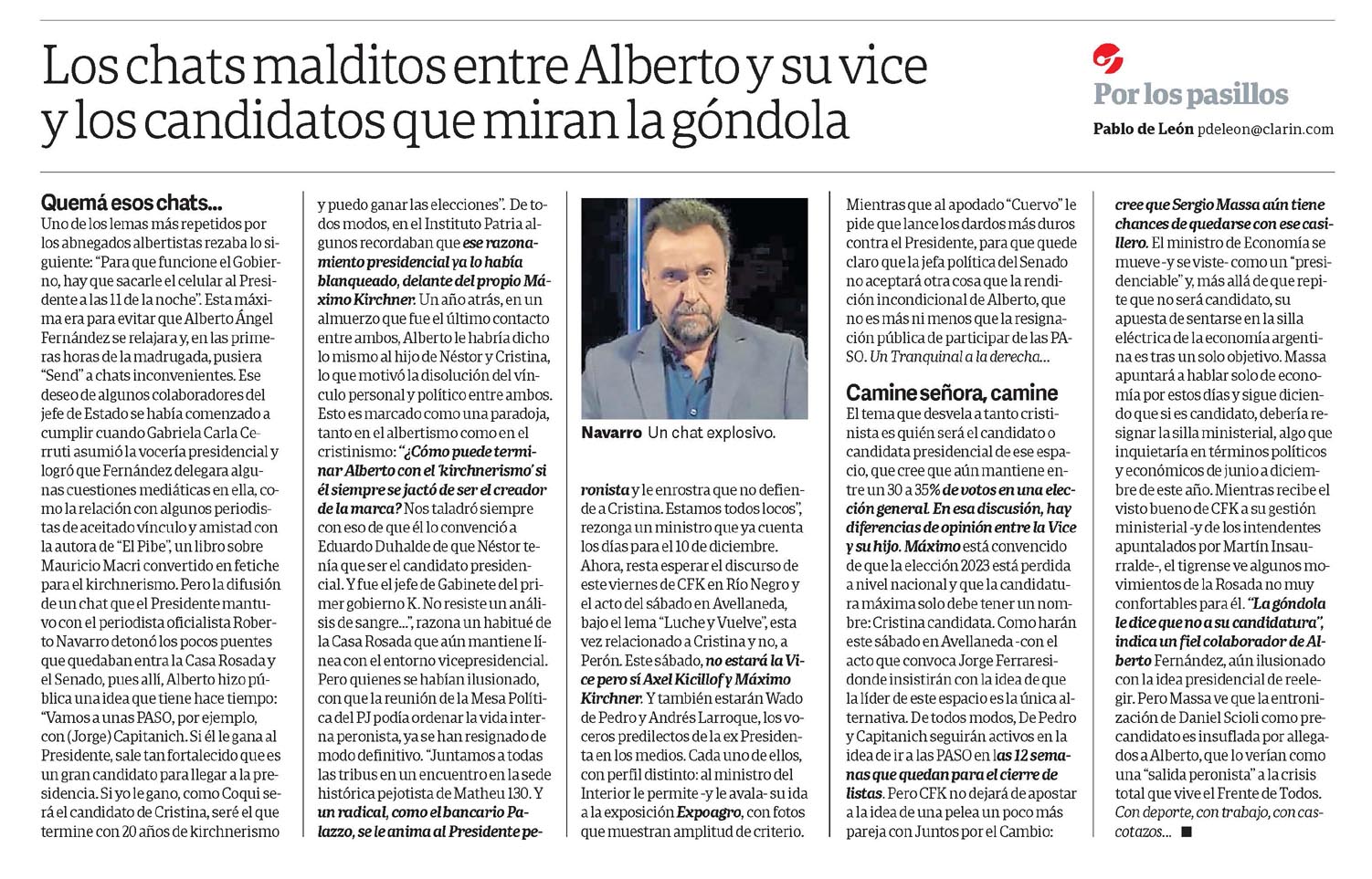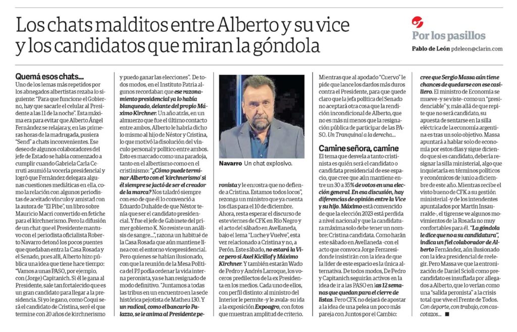 Uno de los lemas más repetidos por los abnegados albertistas rezaba lo siguiente: «Para que funcione el Gobierno, hay que sacarle el celular al Presidente a las 11 de la noche». Esta máxima era para evitar que Alberto Ángel Fernández se relajara y, en las primeras horas de la madrugada, pusiera «Send» a chats inconvenientes. Ese deseo de algunos colaboradores del jefe de Estado se había comenzado a cumplir cuando Gabriela Carla Cerruti asumió la vocería presidencial y logró que Fernández delegara algunas cuestiones mediáticas en ella, como la relación con algunos periodistas de aceitado vínculo y amistad con la autora de «El Pibe», un libro sobre Mauricio Macri convertido en fetiche para el kirchnerismo. Pero la difusión de un chat que el Presidente mantuvo con el periodista oficialista Roberto Navarro detonó los pocos puentes que quedaban entra la Casa Rosada y el Senado, pues allí, Alberto hizo pública una idea que tiene hace tiempo: «Vamos a unas PASO, por ejemplo, con (Jorge) Capitanich. Si él le gana al Presidente, sale tan fortalecido que es un gran candidato para llegar a la presidencia.