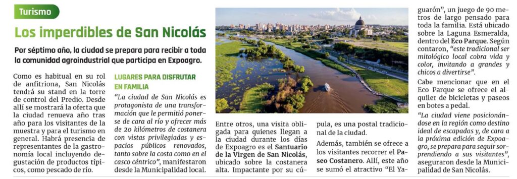Por séptimo año, la ciudad se prepara para recibir a toda la comunidad agroindustrial que participa en Expoagro.Como es habitual en su rol de anfitriona, San Nicolás tendrá su stand en la torre de control del Predio. Desde allí se mostrará la oferta que la ciudad renueva año tras año para los visitantes de la muestra y para el turismo en general. Habrá presencia de representantes de la gastronomía local incluyendo degustación de productos típicos, como pescado de río.LUGARES PARA DISFRUTAR EN FAMILIA «La ciudad de San Nicolás es protagonista de una transformación que le permitió ponerse de cara al río y ofrecer más de 2o kilómetros de costanera con vistas privilegiadas y espacios públicos renovados, tanto sobre la costa como en el casco céntrico», manifestaron desde la Municipalidad local.Entre otros, una visita obligada para quienes llegan a la ciudad durante los días de Expoagro es el Santuario de la Virgen de San Nicolás, ubicado sobre la costanera alta. Impactante por su cúpula, es una postal tradicional de la ciudad.Además, también se ofrece a los visitantes recorrer el Paseo Costanero. Allí, este año se sumó el atractivo «El Ya- guarón», un juego de 90 metros de largo pensado para toda la familia. Está ubicado sobre la Laguna Esmeralda, dentro del Eco Parque. Según contaron, «este tradicional ser mitológico local cobra vida y color, invitando a grandes y chicos a divertirse».Cabe mencionar que en el Eco Parque se ofrece el alquiler de bicicletas y paseos en botes a pedal.»La ciudad viene posicionán- dose en la región como destino ideal de escapadas y, de cara a la próxima edición de Expoagro, se prepara para seguir sorprendiendo a sus visitantes», aseguraron desde la Municipalidad de San Nicolás.