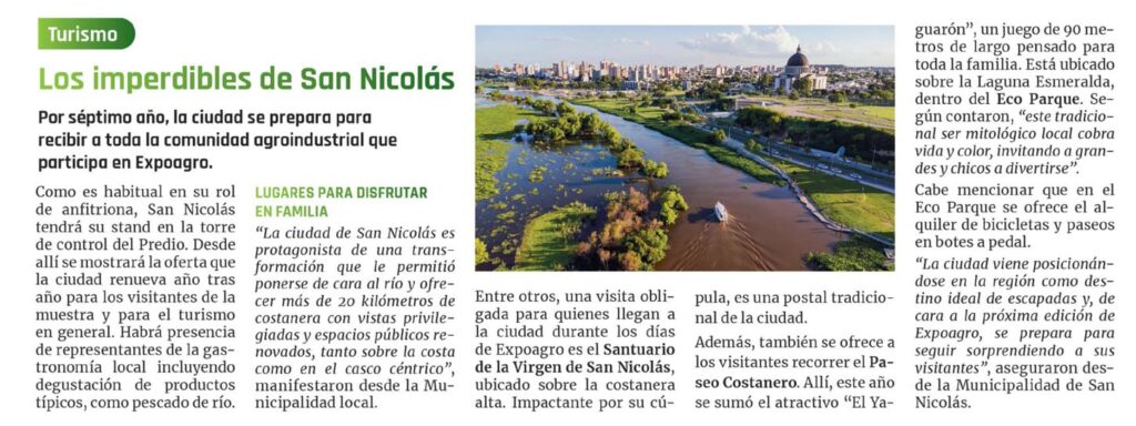 Por séptimo año, la ciudad se prepara para recibir a toda la comunidad agroindustrial que participa en Expoagro.Como es habitual en su rol de anfitriona, San Nicolás tendrá su stand en la torre de control del Predio. Desde allí se mostrará la oferta que la ciudad renueva año tras año para los visitantes de la muestra y para el turismo en general. Habrá presencia de representantes de la gastronomía local incluyendo degustación de productos típicos, como pescado de río.LUGARES PARA DISFRUTAR EN FAMILIA «La ciudad de San Nicolás es protagonista de una transformación que le permitió ponerse de cara al río y ofrecer más de 2o kilómetros de costanera con vistas privilegiadas y espacios públicos renovados, tanto sobre la costa como en el casco céntrico», manifestaron desde la Municipalidad local.Entre otros, una visita obligada para quienes llegan a la ciudad durante los días de Expoagro es el Santuario de la Virgen de San Nicolás, ubicado sobre la costanera alta. Impactante por su cúpula, es una postal tradicional de la ciudad.Además, también se ofrece a los visitantes recorrer el Paseo Costanero. Allí, este año se sumó el atractivo «El Ya- guarón», un juego de 90 metros de largo pensado para toda la familia. Está ubicado sobre la Laguna Esmeralda, dentro del Eco Parque. Según contaron, «este tradicional ser mitológico local cobra vida y color, invitando a grandes y chicos a divertirse».Cabe mencionar que en el Eco Parque se ofrece el alquiler de bicicletas y paseos en botes a pedal.»La ciudad viene posicionán- dose en la región como destino ideal de escapadas y, de cara a la próxima edición de Expoagro, se prepara para seguir sorprendiendo a sus visitantes», aseguraron desde la Municipalidad de San Nicolás.