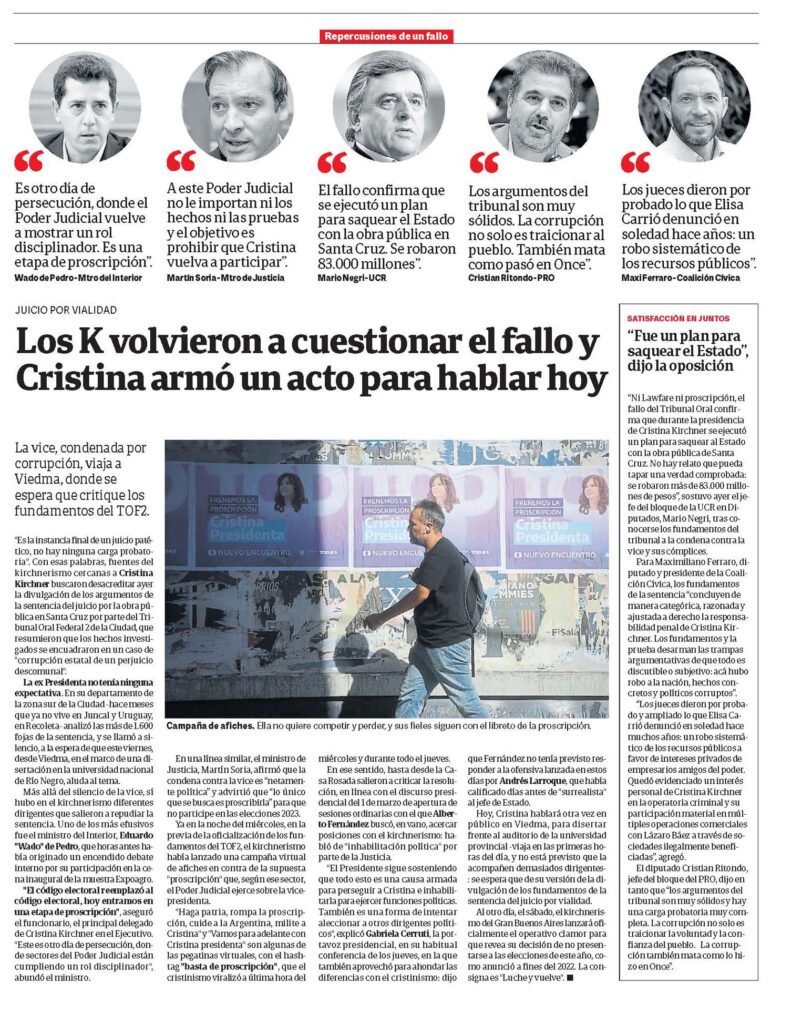 «Ni Lawfare ni proscripción, el fallo del Tribunal Oral confirma que durante la presidencia de Cristina Kirchner se ejecutó un plan para saquear al Estado con la obra pública de Santa Cruz. No hay relato que pueda tapar una verdad comprobada: se robaron más de 83.000 millones de pesos», sostuvo ayer el jefe del bloque de la UCR en Diputados, Mario Negri, tras conocerse los fundamentos del tribunal a la condena contra la vice y sus cómplices.