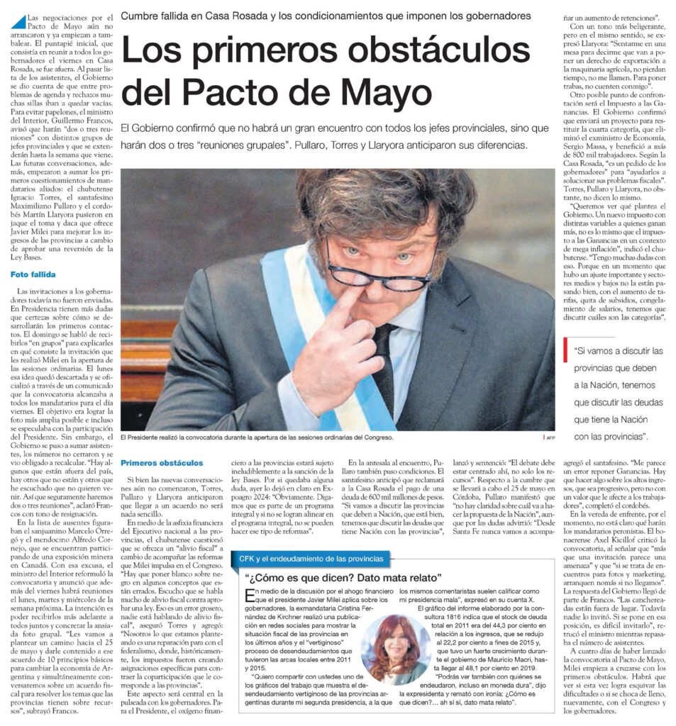 El Gobierno confirmó que no habrá un gran encuentro con todos los jefes provinciales, sino que harán dos o tres «reuniones grupales». Pullaro, Torres y Llaryora anticiparon sus diferencias.Las negociaciones por el Pacto de Mayo aún no arrancaron y ya empiezan a tambalear.El puntapié inicial, que consistía en reunir a todos los gobernadores el viernes en Casa Rosada, se fue afuera. Al pasar lista de los asistentes, el Gobierno se dio cuenta de que entre problemas de agenda y rechazos muchas sillas iban a quedar vacías.Para evitar papelones, el ministro del Interior, Guillermo Francos, avisó que harán «dos o tres reuniones» con distintos grupos de jefes provinciales y que se extenderán hasta la semana que viene.Las futuras conversaciones, además, empezaron a sumar los primeros cuestionamientos de mandatarios aliados: el chubutense Ignacio Torres, el santafesino Maximiliano Pullaro y el cordobés Martín Llaryora pusieron en jaque el toma y daca que ofrece Javier Milei para mejorar los ingresos de las provincias a cambio de aprobar una reversión de la Ley Bases.Foto fallida Las invitaciones a los gobernadores todavía no fueron enviadas.En Presidencia tienen más dudas que certezas sobre cómo se de – sarrollarán los primeros contactos.El domingo se habló de recibirlos «en grupos» para explicarles en qué consiste la invitación que les realizó Milei en la apertura de las sesiones ordinarias. El lunes esa idea quedó descartada y se oficializó a través de un comunicado que la convocatoria alcanzaba a todos los mandatarios para el día viernes. El objetivo era lograr la foto más amplia posible e incluso se especulaba con la participación del Presidente. Sin embargo, el Gobierno se puso a sumar asistentes, los números no cerraron y se vio obligado a recalcular. «Hay algunos que están afuera del país, hay otros que no están y otros que he escuchado que no quieren venir.Así que seguramente haremos dos o tres reuniones», aclaró Francos con tono de resignación.En la lista de ausentes figuraban el sanjuanino Marcelo Orregó y el mendocino Alfredo Cornejo, que se encuentran participando de una exposición minera en Canadá. Con esa excusa, el ministro del Interior reformuló la convocatoria y anunció que además del viernes habrá reuniones el lunes, martes y miércoles de la semana próxima. La intención es poder recibirlos más adelante a todos juntos y concretar la ansiada foto grupal. «Les vamos a plantear un camino hacia el 25 de mayo y darle contenido a ese acuerdo de 10 principios básicos para cambiar la economía de Argentina y simultáneamente conversaremos sobre un acuerdo fiscal para resolver los temas que las provincias tienen sobre recursos», subrayó Francos. Primeros obstáculos Si bien las nuevas conversaciones aún no comenzaron, Torres, Pullaro y Llaryora anticiparon que llegar a un acuerdo no será nada sencillo.En medio de la asfixia financiera del Ejecutivo nacional a las provincias, el chubutense cuestionó que se ofrezca un «alivio fiscal» a cambio de acompañar las reformas que Milei impulsa en el Congreso.»Hay que poner blanco sobre negro en algunos conceptos que están errados. Escucho que se habla mucho de alivio fiscal contra aprobar una ley. Eso es un error grosero, nadie está hablando de alivio fiscal», aseguró Torres y agregó: «Nosotros lo que estamos planteando es una reparación para con el federalismo, donde, históricamente, los impuestos fueron creando asignaciones específicas para contraer la coparticipación que le corresponde a las provincias».Este aspecto será central en la pulseada con los gobernadores. Para el Presidente, el oxígeno financiero a las provincias estará sujeto ineludiblemente a la sanción de la ley Bases. Por si quedaba alguna duda, ayer lo dejó en claro en Expoagro 2024: «Obviamente. Digamos que es parte de un programa integral y si no se logran alinear en el programa integral, no se pueden hacer ese tipo de reformas».En la antesala al encuentro, Pullaro también puso condiciones. El santafesino anticipó que reclamará a la Casa Rosada el pago de una deuda de 600 mil millones de pesos.»Si vamos a discutir las provincias que deben a Nación, que está bien, tenemos que discutir las deudas que tiene Nación con las provincias», lanzó y sentenció: «El debate debe estar centrado ahí, no solo los recursos».Respecto a la cumbre que se llevará a cabo el 25 de mayo en Córdoba, Pullaro manifestó que «no hay claridad sobre cuál va a hacer la propuesta de la Nación», aunque por las dudas advirtió: «Desde Santa Fe nunca vamos a acompa- ñar un aumento de retenciones».Con un tono más beligerante, pero en el mismo sentido, se expresó Llaryora: «Sentarme en una mesa para decirme que van a poner un derecho de exportación a la maquinaria agrícola, no pierdan tiempo, no me llamen. Para poner trabas, no cuenten conmigo».Otro posible punto de confrontación será el Impuesto a las Ganancias.El Gobierno confirmó que enviará un proyecto para restituir la cuarta categoría, que eliminó el exministro de Economía, Sergio Massa, y benefició a más de 800 mil trabajadores. Según la Casa Rosada, «es un pedido de los gobernadores» para «ayudarlos a solucionar sus problemas fiscales».Torres, Pullaro y Llaryora, no obstante, no dicen lo mismo.»Queremos ver qué plantea el Gobierno. Un nuevo impuesto con distintas variables a quienes ganan más, no es lo mismo que el impuesto a las Ganancias en un contexto de mega inflación», indicó el chubutense.»Tengo muchas dudas con eso. Porque en un momento que hubo un ajuste importante y sectores medios y bajos no la están pasando bien, con el aumento de tarifas, quita de subsidios, congelamiento de salarios, tenemos que discutir cuáles son las categorías», agregó el santafesino. «Me parece un error reponer Ganancias. Hay que hacer algo sobre los altos ingresos, que sea progresivo, pero no con un valor que le afecte a los trabajadore