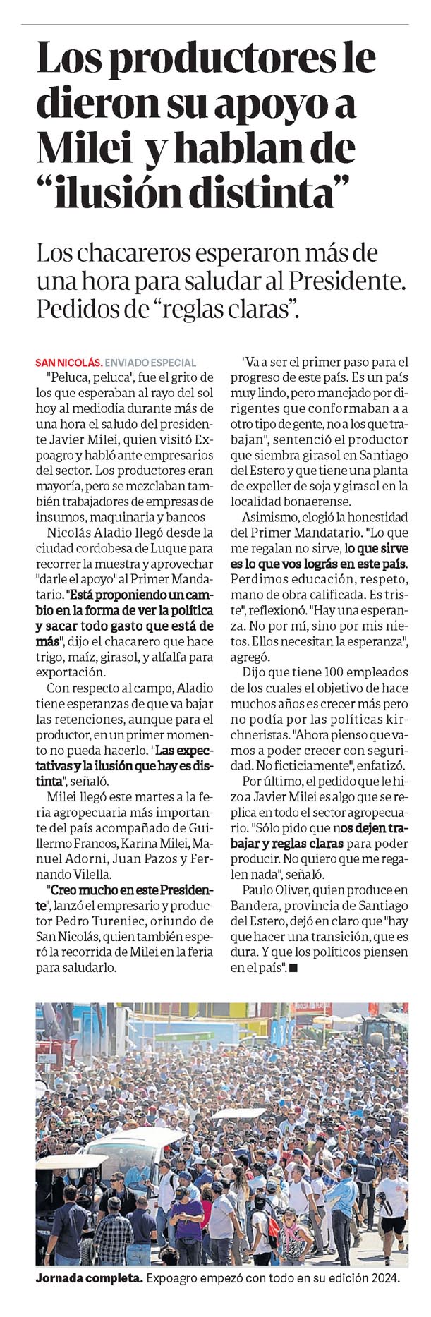 SAN NICOLÁS. ENVIADO ESPECIAL «Peluca, peluca», fue el grito de los que esperaban al rayo del sol hoy al mediodía durante más de una hora el saludo del presidente Javier Milei, quien visitó Expoagro y habló ante empresarios del sector. Los productores eran mayoría, pero se mezclaban también trabajadores de empresas de insumos, maquinaria y bancos Nicolás Aladio llegó desde la ciudad cordobesa de Luque para recorrer la muestra y aprovechar «darle el apoyo» al Primer Mandatario.