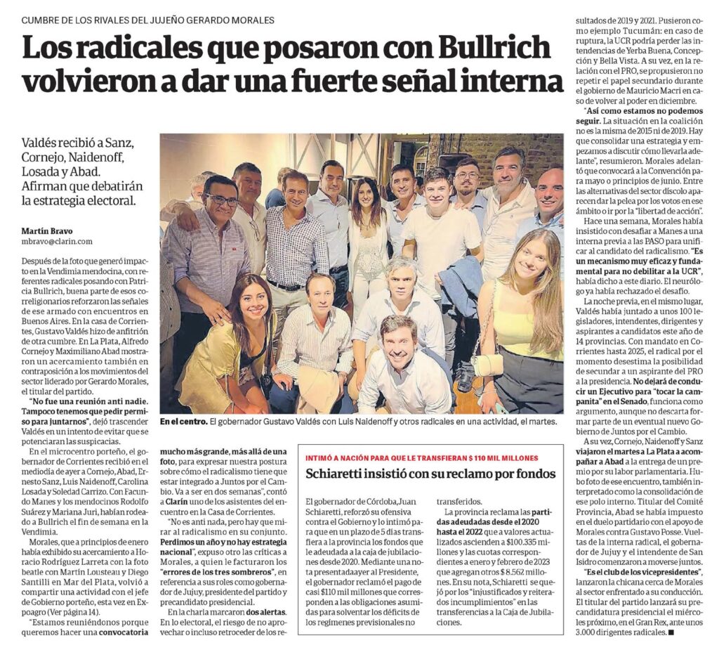 A su vez, Cornejo, Naidenoff y Sanz viajaron el martes a La Plata a acompañar a Abad a la entrega de un premio por su labor parlamentaria. Hubo foto de ese encuentro, también interpretado como la consolidación de ese polo interno. Titular del Comité Provincia, Abad se había impuesto en el duelo partidario con el apoyo de Morales contra Gustavo Posse. Vueltas de la interna radical, el gobernador de Jujuy y el intendente de San Isidro comenzaron a moverse juntos.