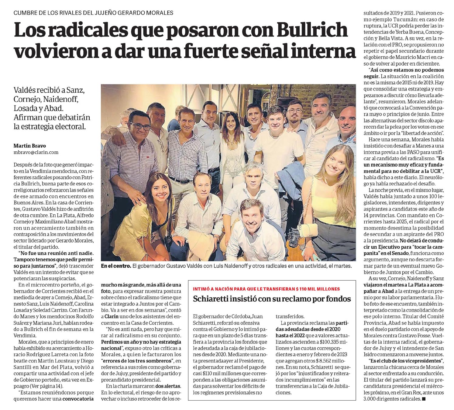 En el microcentro porteño, el gobernador de Corrientes recibió en el mediodía de ayer a Cornejo, Abad, Ernesto Sanz, Luis Naidenoff, Carolina Losada y Soledad Carrizo. Con Facundo Manes y los mendocinos Rodolfo Suárez y Mariana Juri, habían rodeado a Bullrich el fin de semana en la Vendimia.