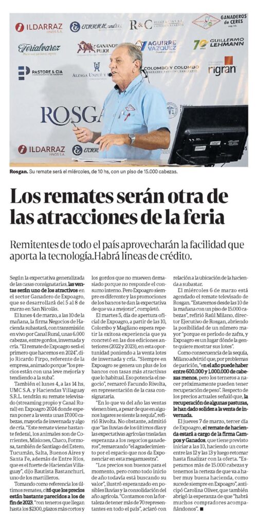 Remitentes de todo el país aprovecharán la facilidad que aporta la tecnología.Habrá líneas de crédito.Rosgan. Su remate será el miércoles, de 10 hs, con un piso de 15.000 cabezas.Según la expectativa generalizada de las casas consignatarias, las ventas serán uno de los atractivos en el sector Ganadero de Expoagro, que se desarrollará del 5 al 8 de marzo en San Nicolás.El lunes 4 de marzo, a las 10 de la mañana, la firma Negocios de Hacienda subastará, con transmisión en vivo por Canal Rural, unas 6.000 cabezas, entre gordos, invernada y cría. «El remate de Expoagro será el primero que hacemos en 2024″, dijo Ricardo Firpo, referente de la empresa, animado porque «los precios están con una leve mejoría y tendiendo a la suba».También el lunes 4, a las 14 hs, UMC S.A. y Haciendas Villaguay S.R.L. tendrán su remate televisado (streaming propio y Canal Rural) en Expoagro 2024 donde esperan poner a la venta unas 17.000 cabezas, mayoría de invernada y algo de cría. «Este remate viene bastante federal, los animales son de Corrientes, Misiones, Chaco, Formosa, también de Santiago del Estero, Tucumán, Salta, Buenos Aires y Santa Fe, además de Entre Ríos, que es el fuerte de Haciendas Villaguay», dijo Bautista Bastanchuri, uno de los martilleros.Tomando como referencia los últimos remates, citó que los precios están bastante parecidos a los de fin de 2023, «con teneros que llegan hasta los $2300, plazos más cortos y los gordos que no mueven demasiado porque no responde el consumo interno. Pero Expoagro siempre es diferente y las promociones de los bancos te dan la expectativa de que va a mejorar», completó.El martes 5, día de apertura oficial de Expoagro, a partir de las 10, Colombo y Magliano espera repetir la exitosa experiencia que ya concretó en las dos ediciones anteriores (2022 y 2023), en esta oportunidad poniendo a la venta lotes de invernada y cría. «Siempre en Expoagro se genera un plus de los bancos con tasas más atractivas que lo habitual. Eso potencia el negocio», remarcó Facundo Rivolta, en representación de la casa consignataria.»En lo que va del año las ventas vienen bien, a pesar de que en algunos lugares se siente la sequía», refirió Rivolta. No obstante, admitió que «las lluvias de los últimos días y las expectativas agrícolas trasladan esperanza a los negocios ganaderos», remarcando «el agradecimiento por el espacio que nos da Exponenciar en esta megamuestra».»Los precios son buenos para el momento, pero como todo inicio de año todavía está buscando su valor», ilustró esperanzado en posibles lluvias y la consolidación del año agrícola. «Contamos con la fortaleza de tener más de 70 representantes en todo el país», aclaró con relación a la ubicación de la hacienda a subastar.El miércoles 6 de marzo está agendado el remate televisado de Rosgan. «Estaremos desde las 10 de la mañana con un piso de 15.000 cabezas», refirió Raúl Milano, director Ejecutivo de Rosgan, abriendo la posibilidad de un número mayor «porque es período de zafra, y Expoagro es un lugar dónde la gente quiere mostrar sus lotes».Como consecuencia de la sequía, Milano advirtió que, por problemas de parición, «en el año puede haber entre 600.000 y 1.000.000 de cabezas menos, pero los terneros a nacer próximamente pueden tener recuperación de peso». Respecto de los precios actuales señaló que, la recuperación de algunas pasturas, le han dado solidez a la venta de invernada.El jueves 7 de marzo, tercer día de Expoagro, el remate de hacienda estará a cargo de la firma Campos y Ganados, que tiene previsto iniciar a las 10, haciendo un corte entre las 12 y las 13 y luego retomar hasta finalizar con la oferta. «Esperamos más de 15.000 cabezas y tenemos la certeza de que va a haber muy buena hacienda, como sucede siempre en Expoagro«, anticipó Carolina Oliver, que también abrigó la esperanza de que «habrá muchos compradores acompañándonos».